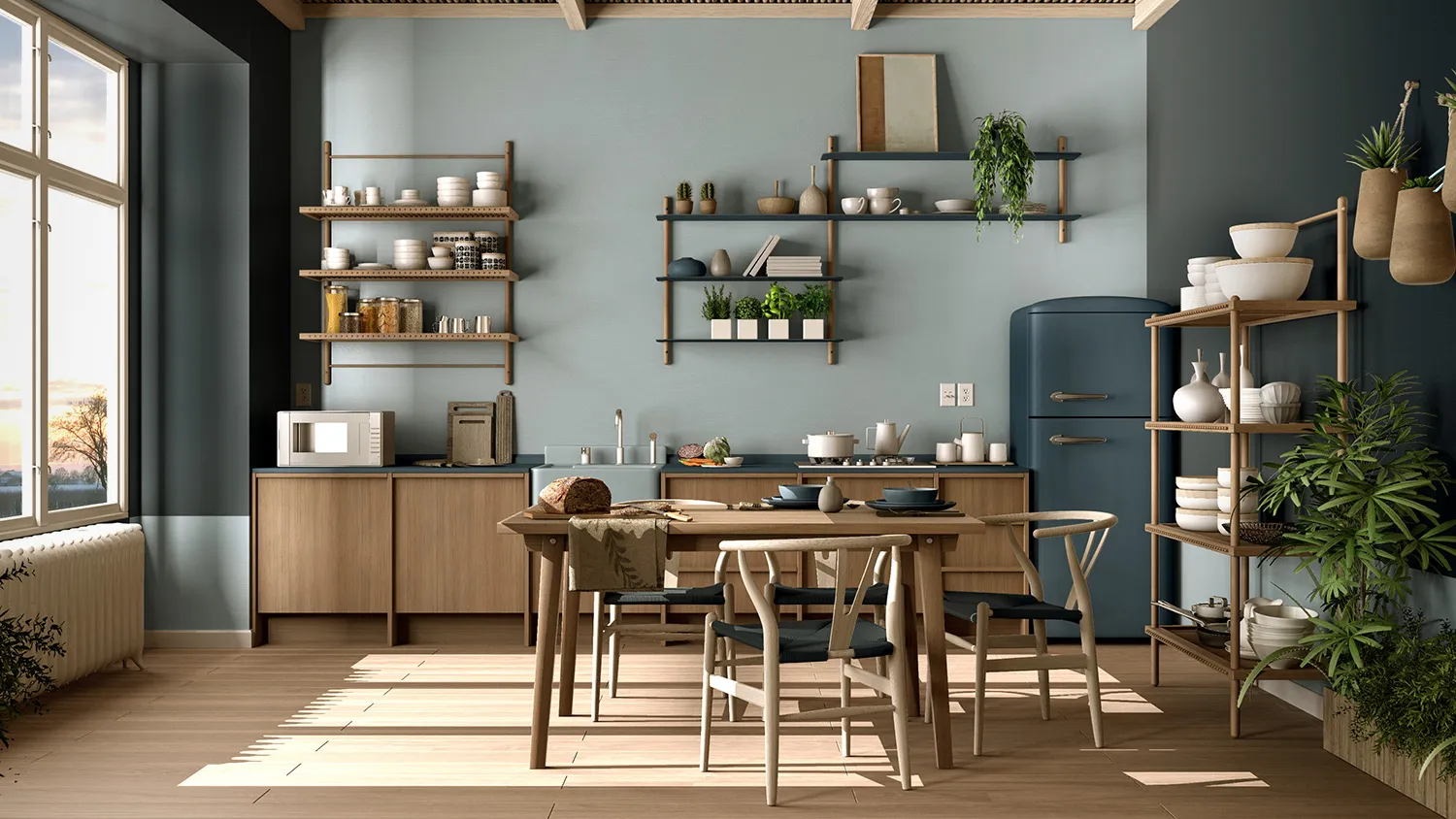 Чайник может быть электрическим. Оптимально выбирать среди керамических моделей — они не нарушат экологическую направленность стиля.