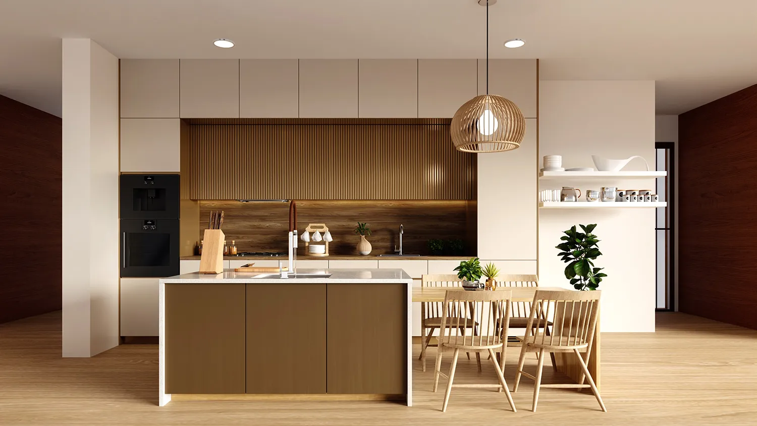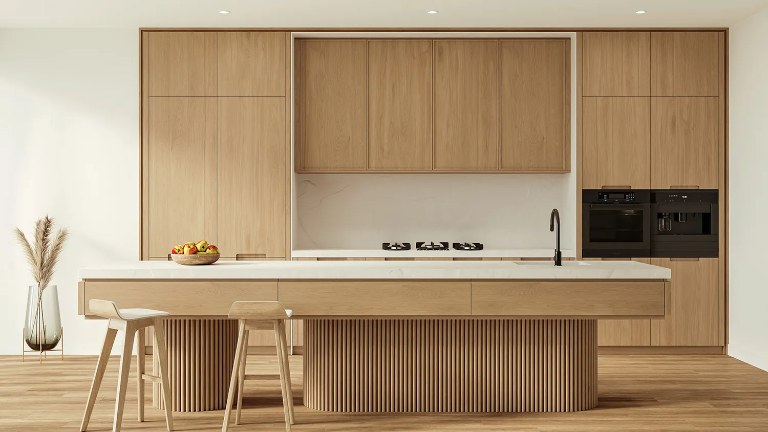 - лаконичные глухие фасады со скрытой фурнитурой и матовой отделкой