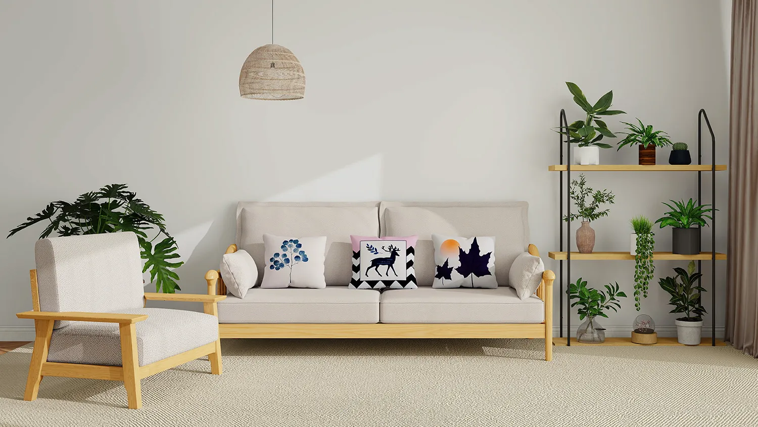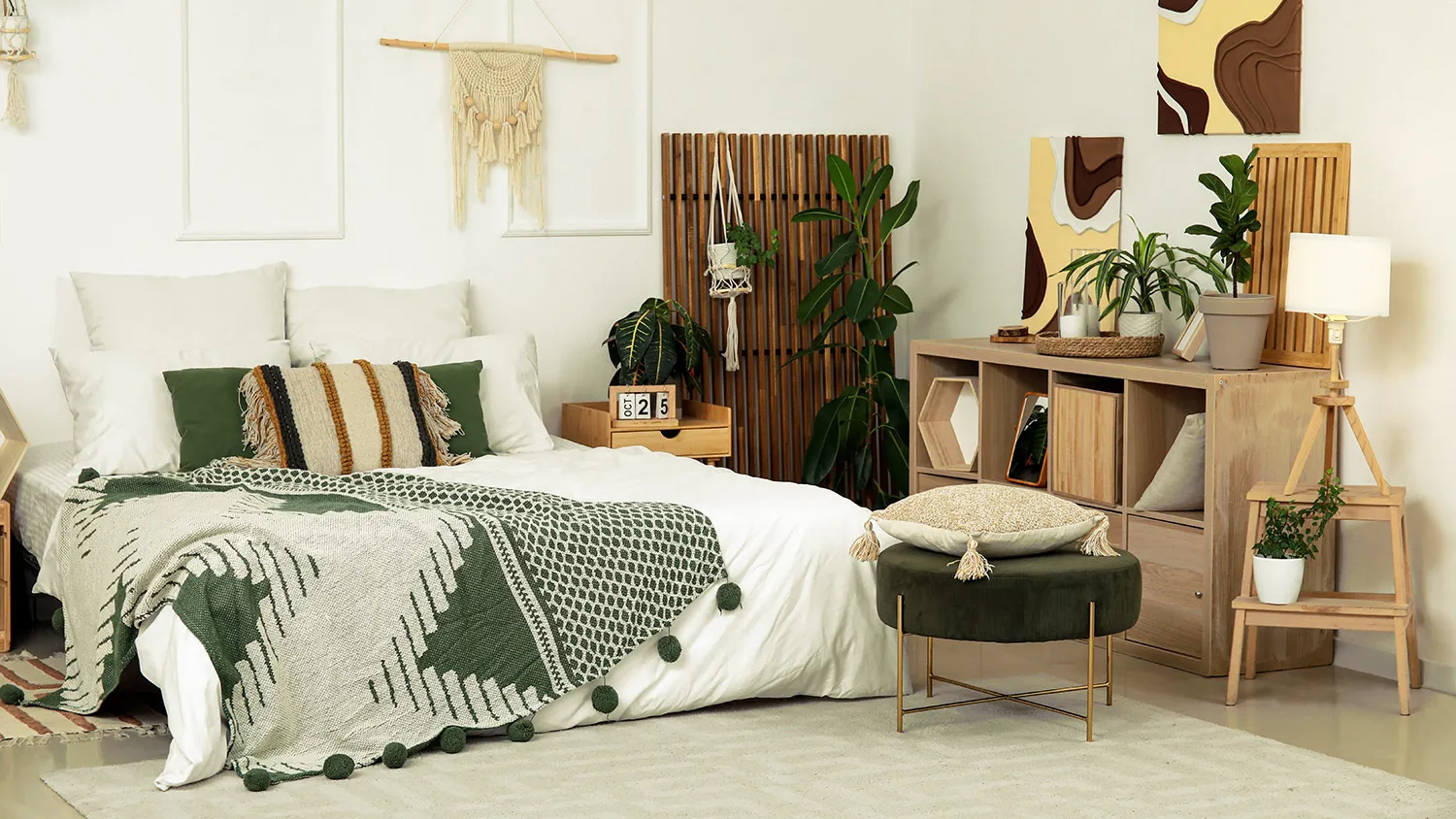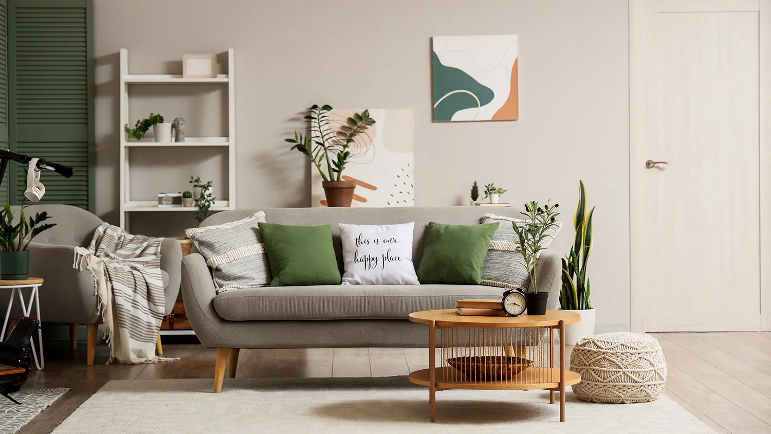 - Нейтральная палитра цветов. Зеленый, бежевый, песочный, коричневый, белый — спокойные оттенки, создающие уют и расслабляющую обстановку. Яркие цвета тоже возможны, но в небольшой пропорции и в виде приглушенных тонов, приближенных к тем, что встречаются в настоящих пейзажах.