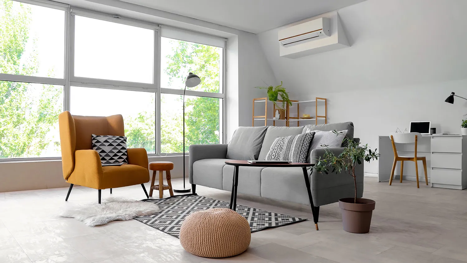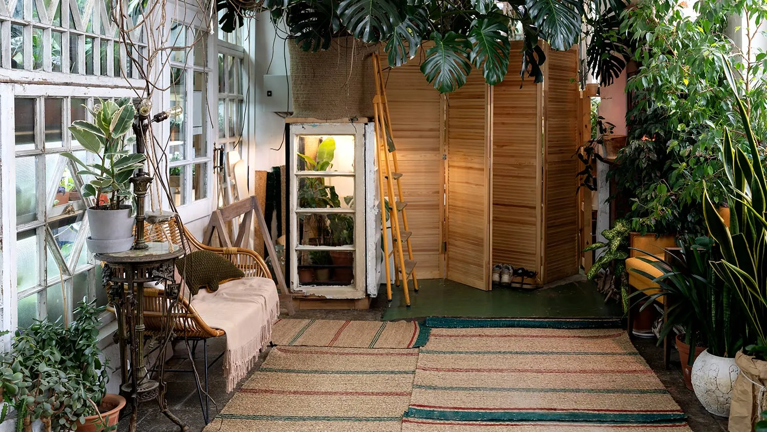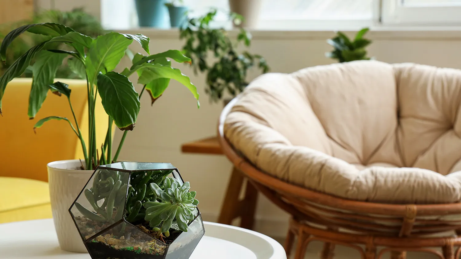 - Обильное озеленение. Комнатные растения очищают воздух, поддерживают влажность и привносят ощущение единения с природой.