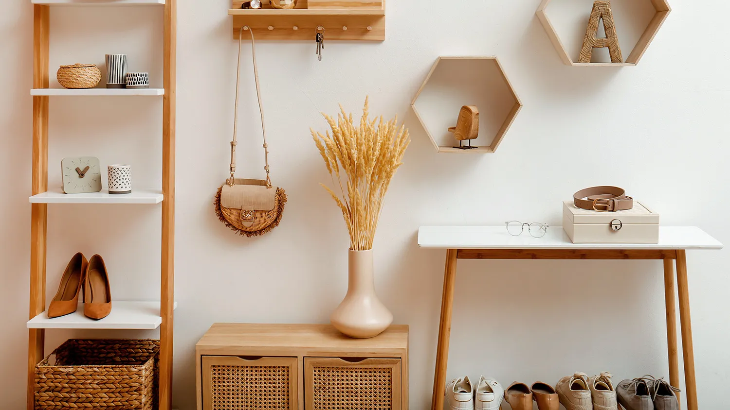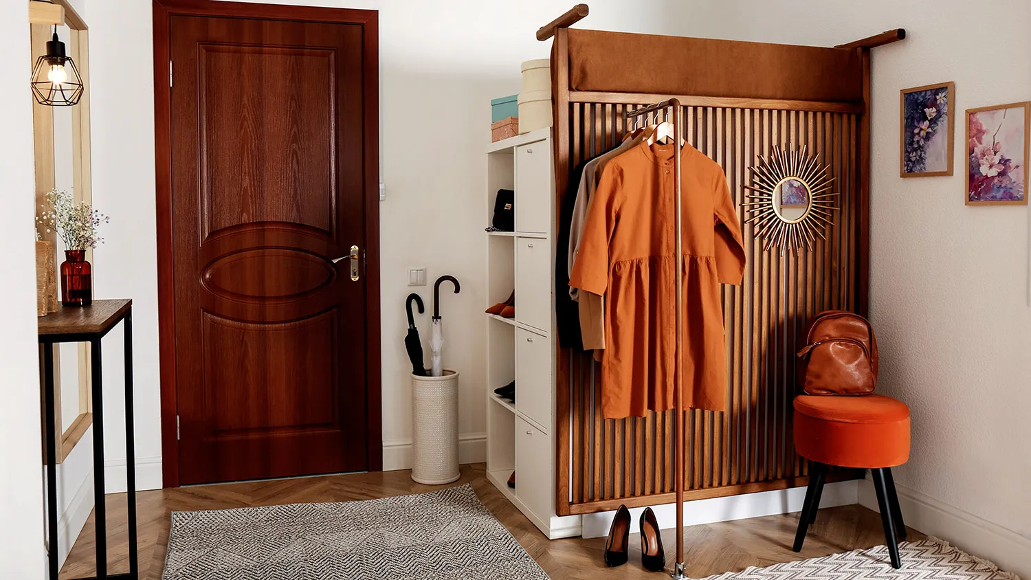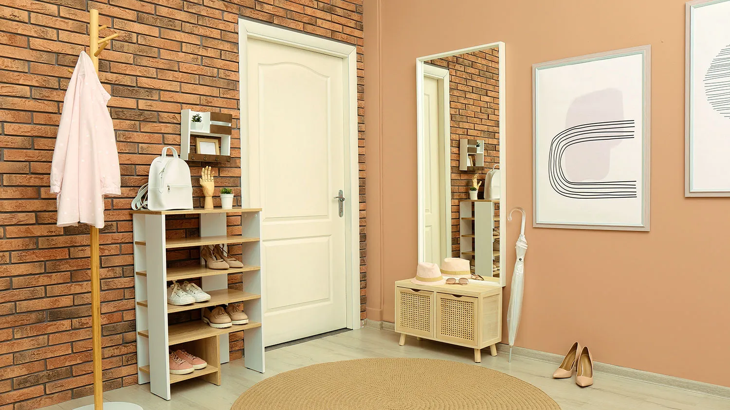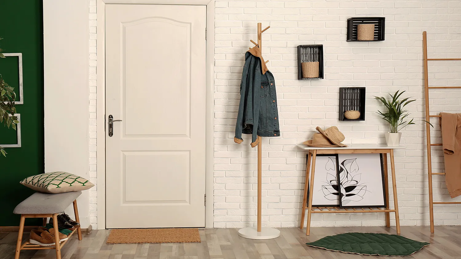 При оформлении входной группы в экостиле лучше отказаться от крупных шкафов и комодов. Хорошо впишутся напольные и настенные вешалки из дерева, сквозные стеллажи, компактные системы хранения с реечными дверцами.