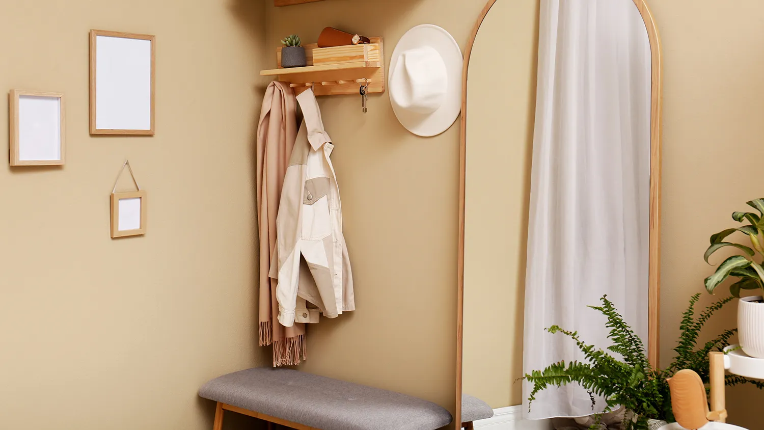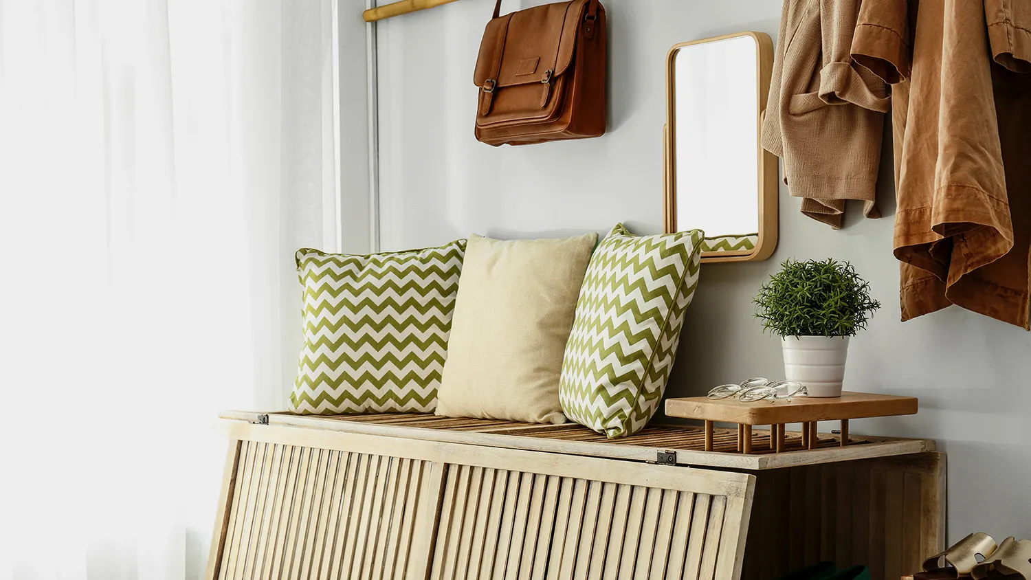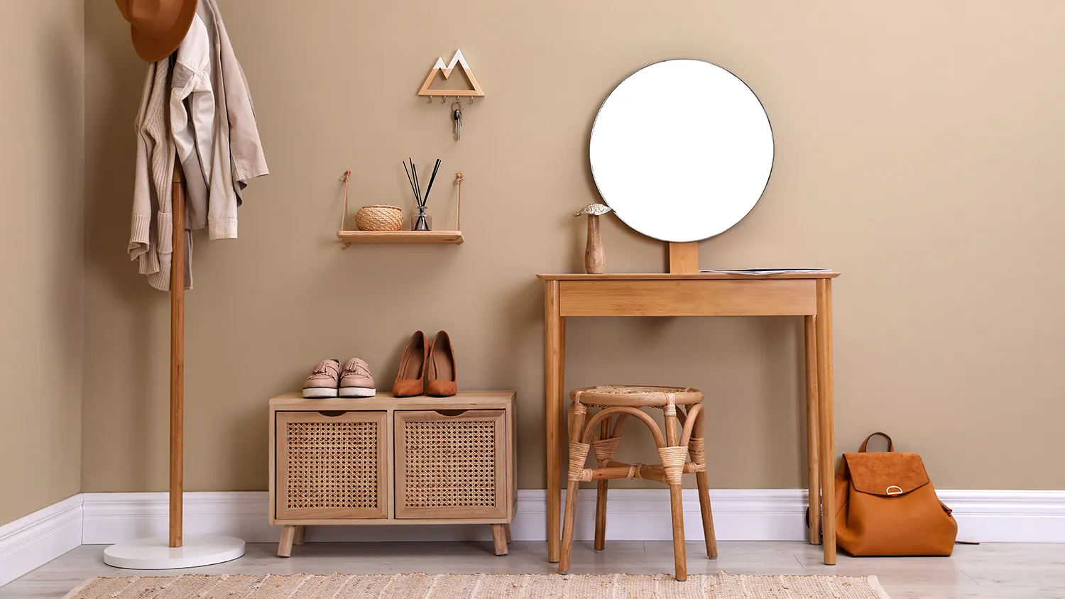 Узнайте большеВместо привычных пуфов установите скамейку или стул, которые могут быть плетеными или деревянными. Оригинально впишутся сиденья-пеньки. Для хранения обуви подойдут обувницы открытого типа. Стильное дополнение интерьеру в экостиле обеспечит плетеная корзина для хранения зонтов.