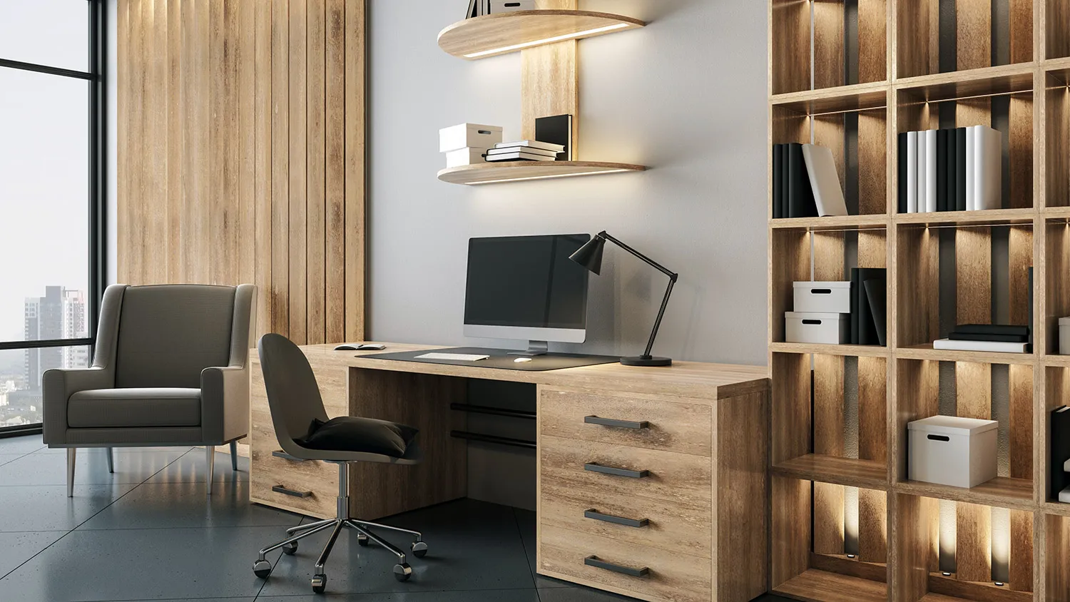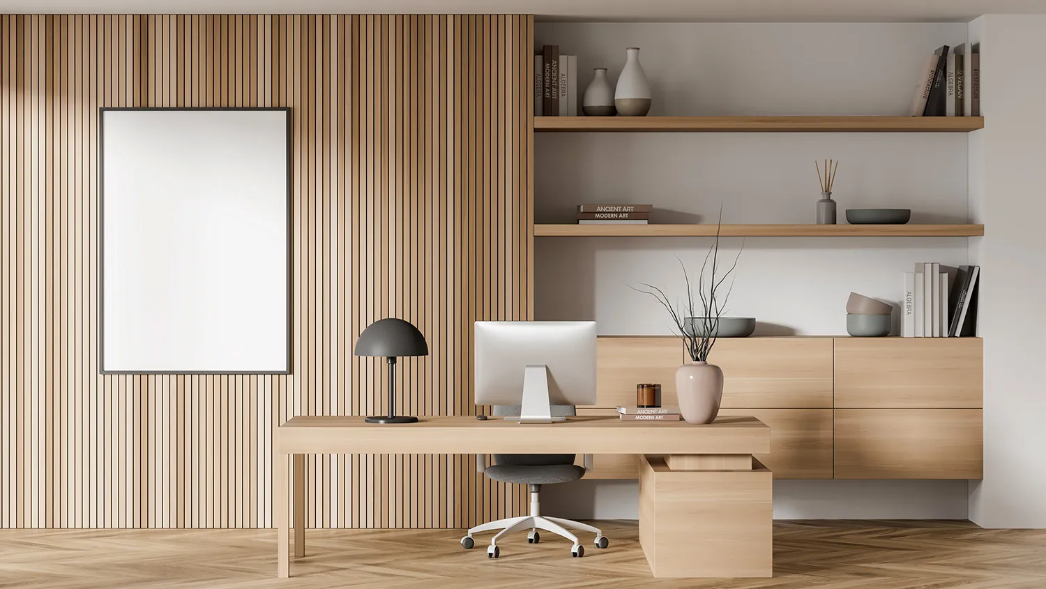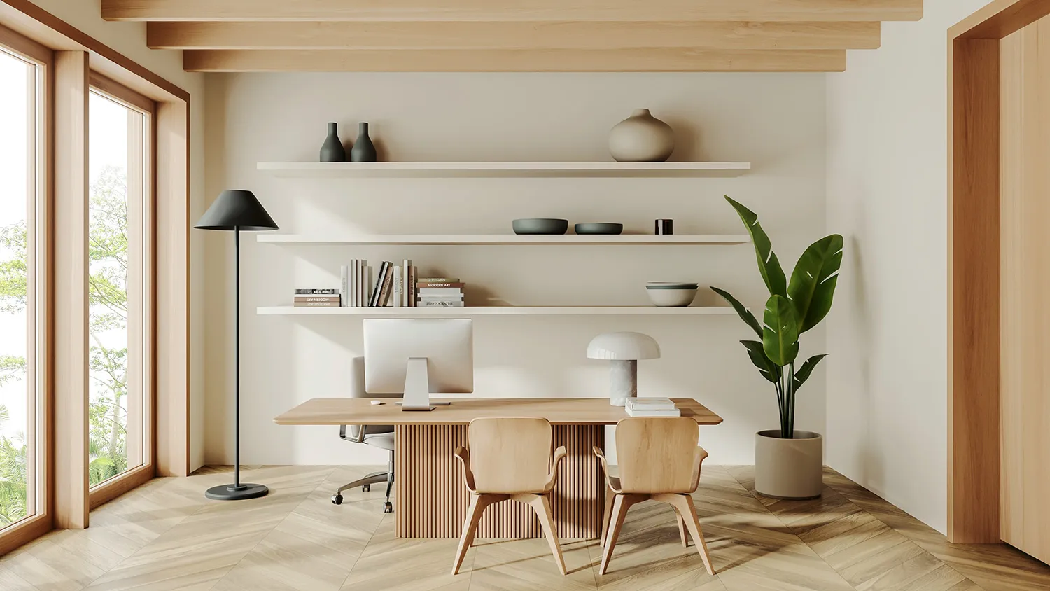 Для хранения книг и документов подойдут деревянные полки и стеллажи. Громоздкие закрытые шкафы лучше не ставить: будут перегружать пространство. Хорошее решение для экостиля — встроенные стеллажи с глухими дверцами, установленные вдоль стен кабинета.
