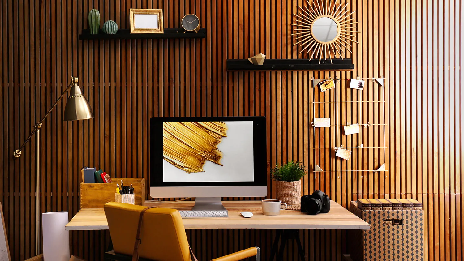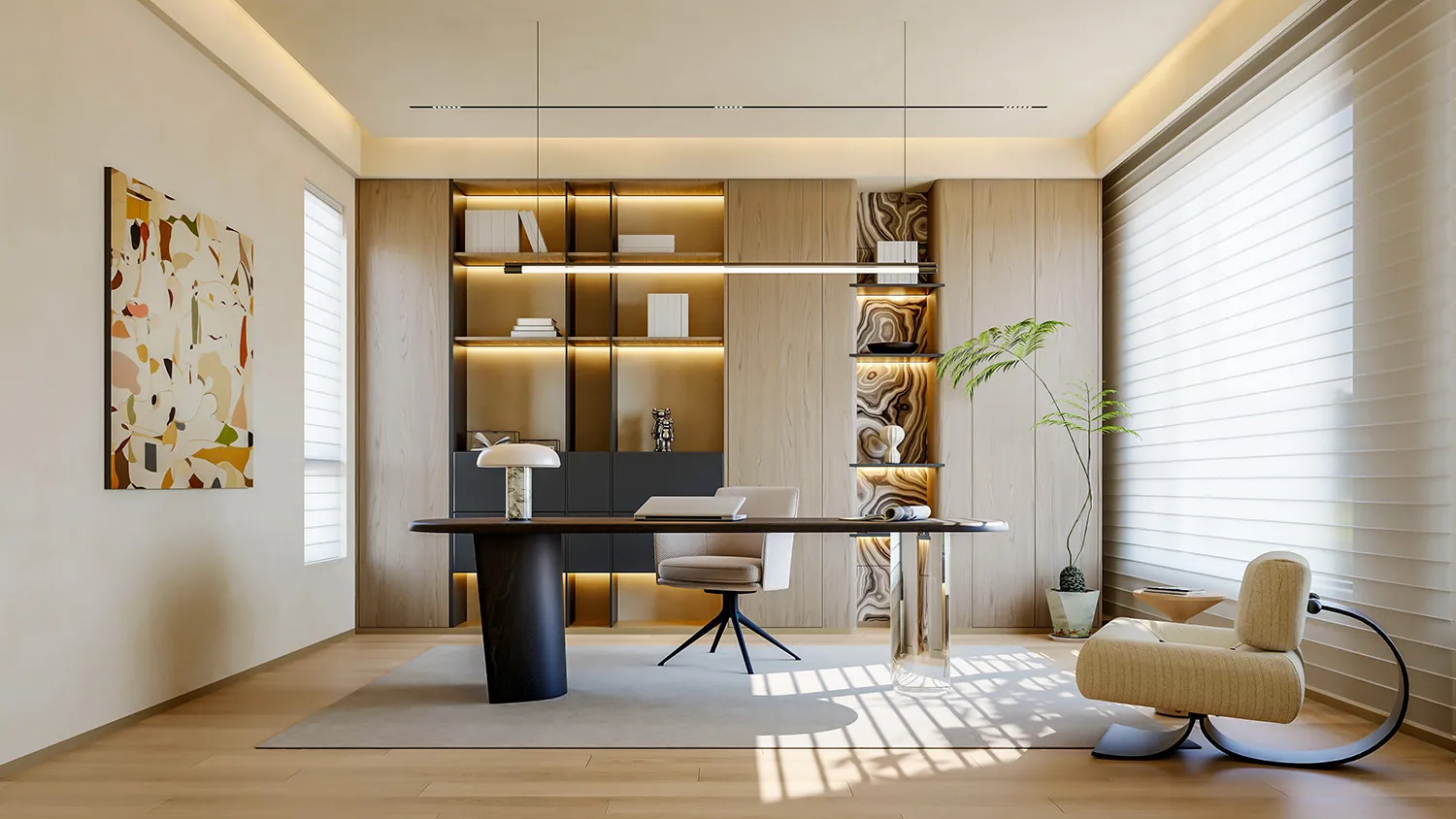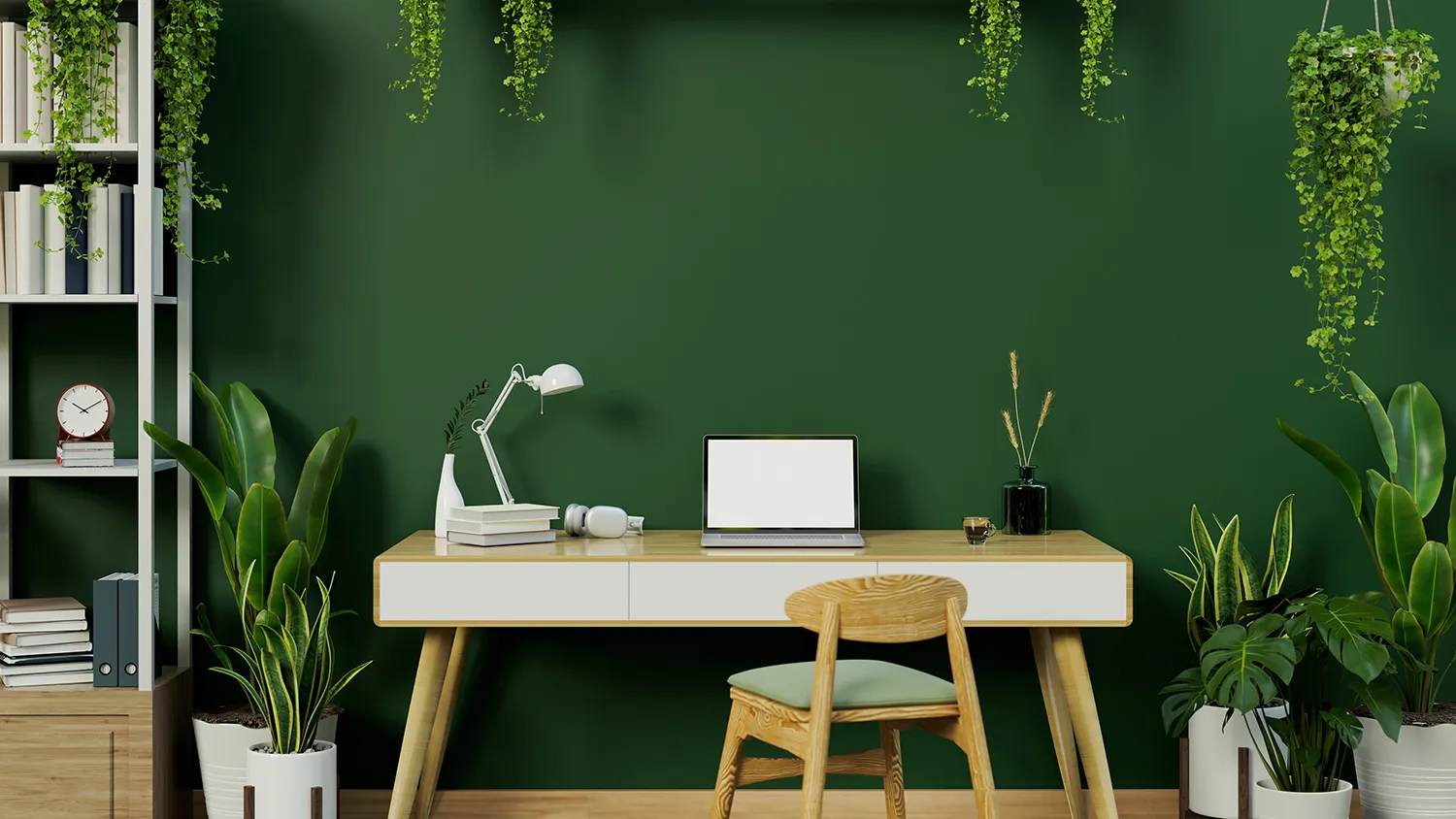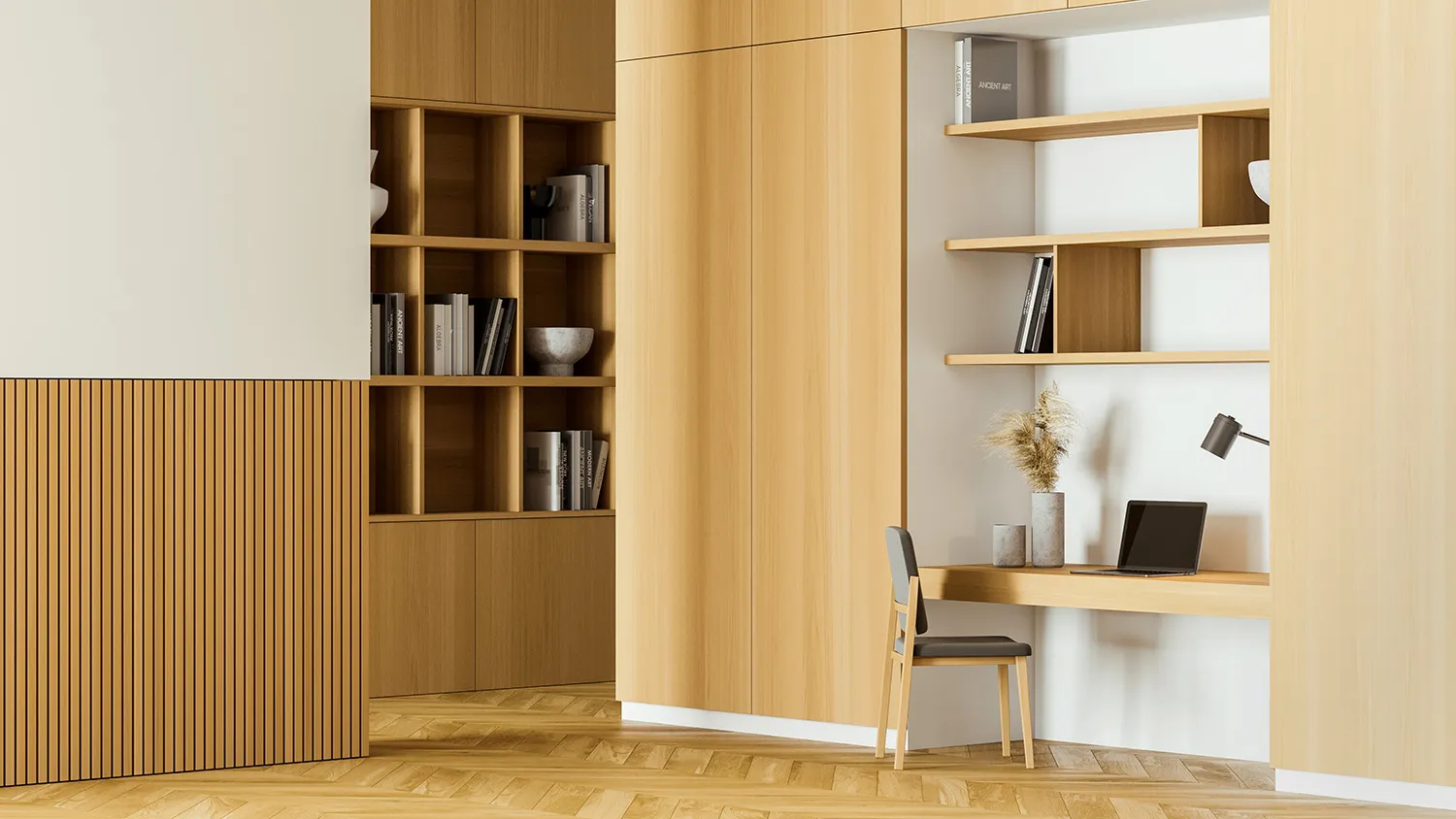 Для хранения книг и документов подойдут деревянные полки и стеллажи. Громоздкие закрытые шкафы лучше не ставить: будут перегружать пространство. Хорошее решение для экостиля — встроенные стеллажи с глухими дверцами, установленные вдоль стен кабинета.
