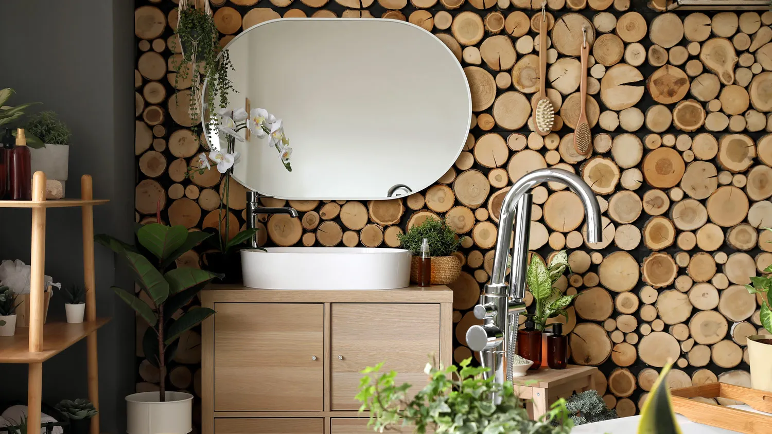 Сама ванна должна быть плавной и обтекаемой формы. При выборе раковины стоит остановиться на накладных моделях или комплектах с тумбой — они хорошо вписываются в экоинтерьер.