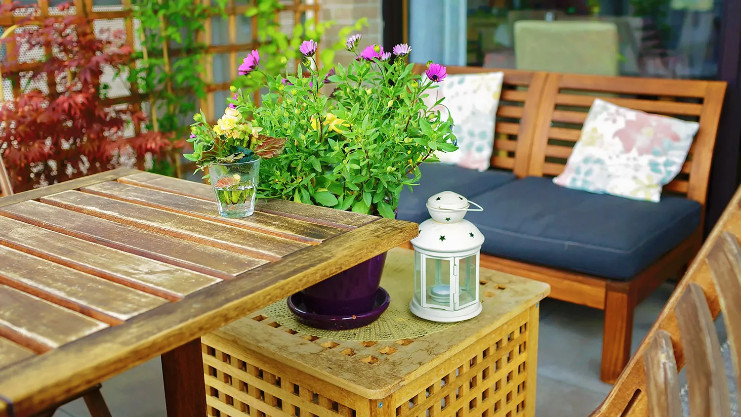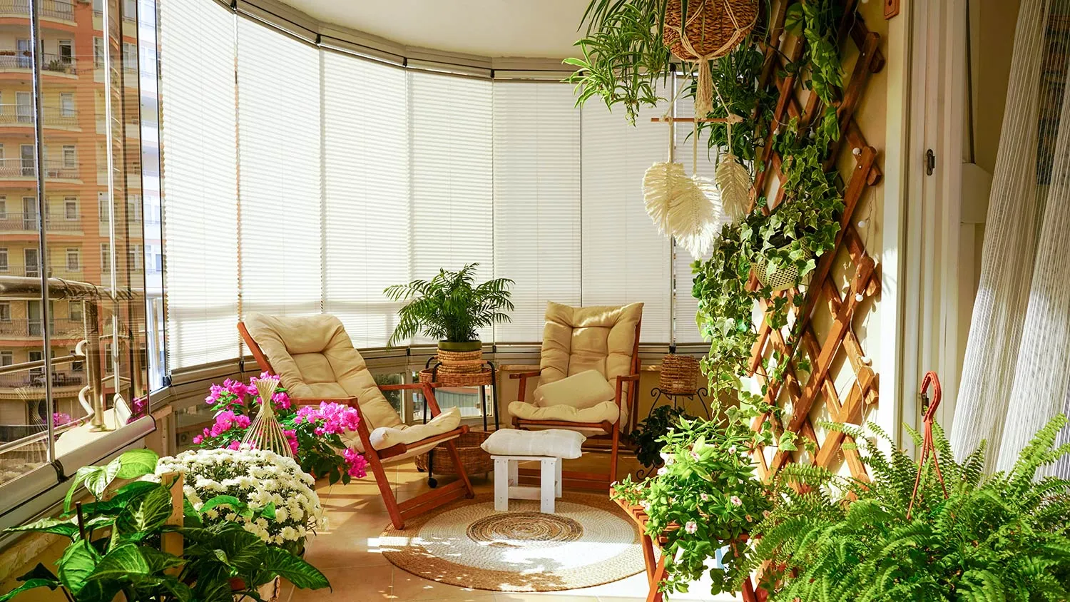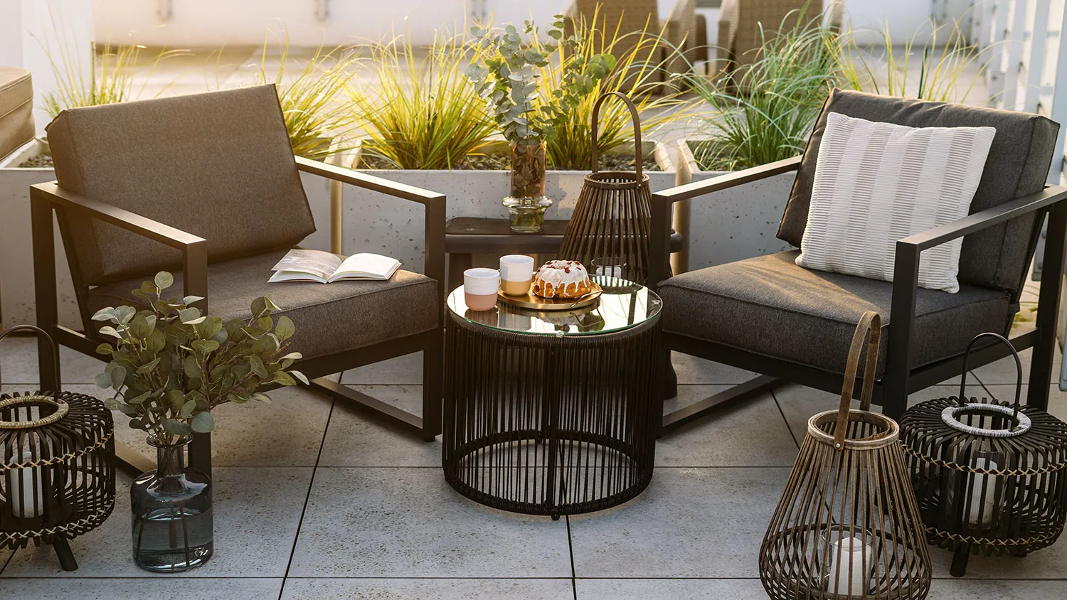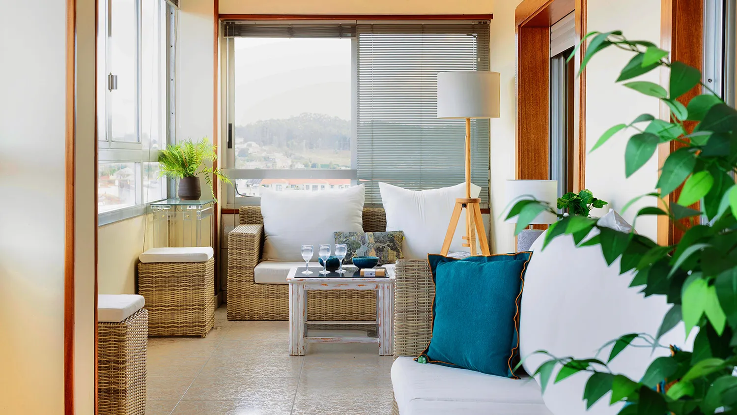 Перила можно оформить вагонкой, а также декорировать соломенными материалами. В зоне отдыха размещают кресла и столик из ротанга или деревянных реек. Оригинальным решением будет установить на балконе или лоджии подвесное плетеное кресло. Создать расслабляющую обстановку помогут свечи, фонари, подушки с наволочками из льна или рогожки.