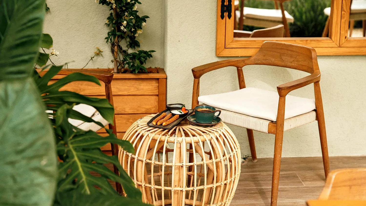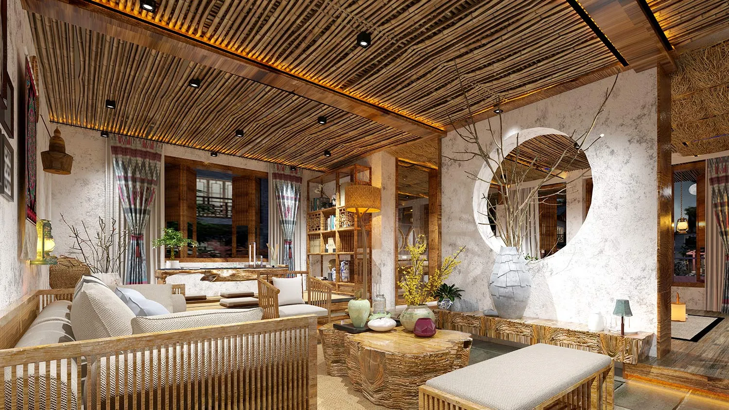 В таких интерьерах можно встретить комбинации необычной мебели и этнических элементов с необработанными фактурами или нетипично яркие акценты на фоне природной цветовой гаммы.