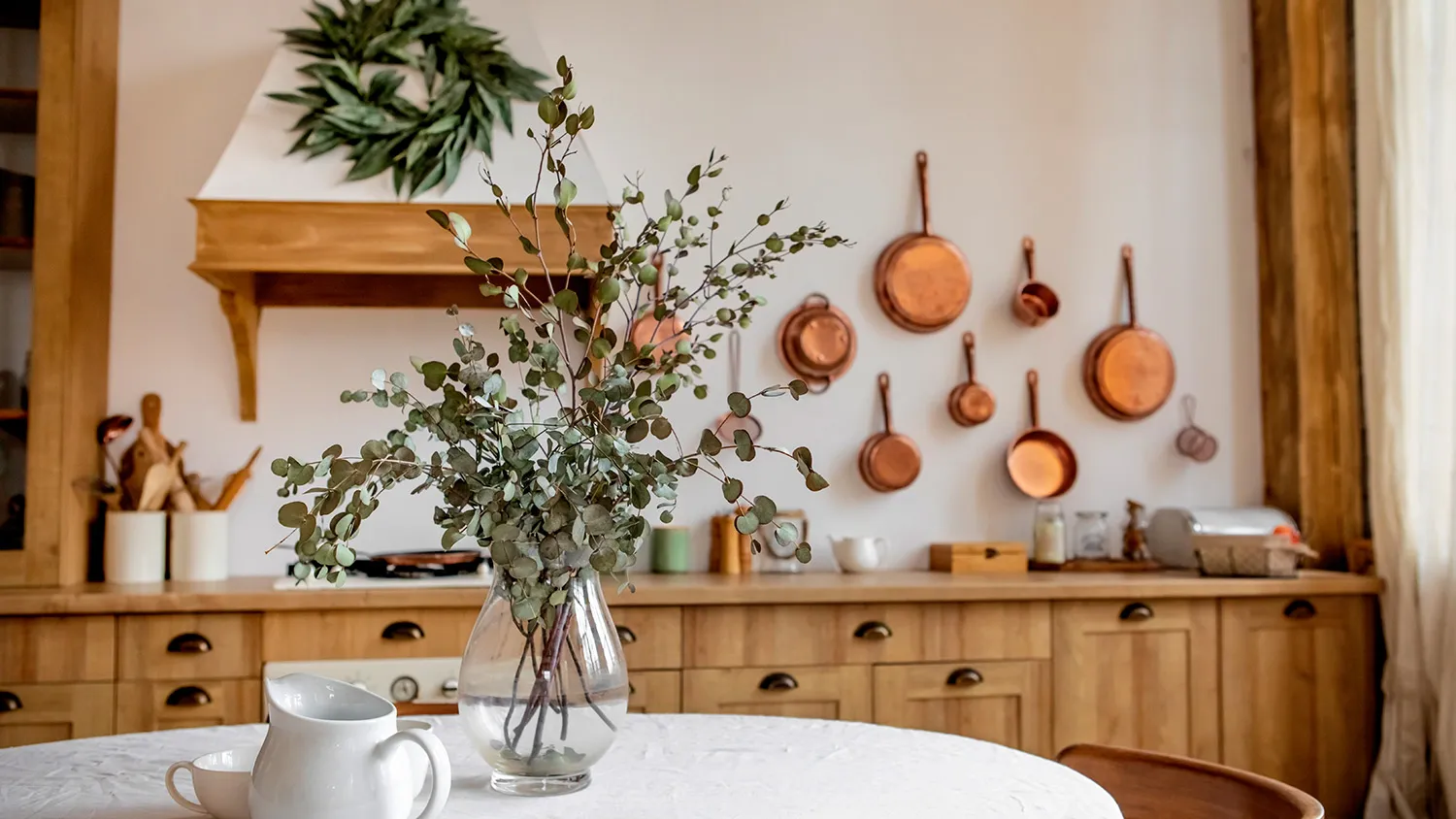 Столешницу лучше сделать из мрамора или массива дерева. Для обеденной группы подбирайте изделия, выполненные из дерева или материалов, хорошо его имитирующих. Мойку для кухни традиционно выбирают каменную светлых оттенков. Изделия из металла не подойдут, поскольку будут нарушать общий колорит. Подходящие основы для фартука рабочей зоны — МДФ, ДСП или искусственный камень. Верхний слой отделки — светлый однотонный, под дерево или другие природные поверхности.