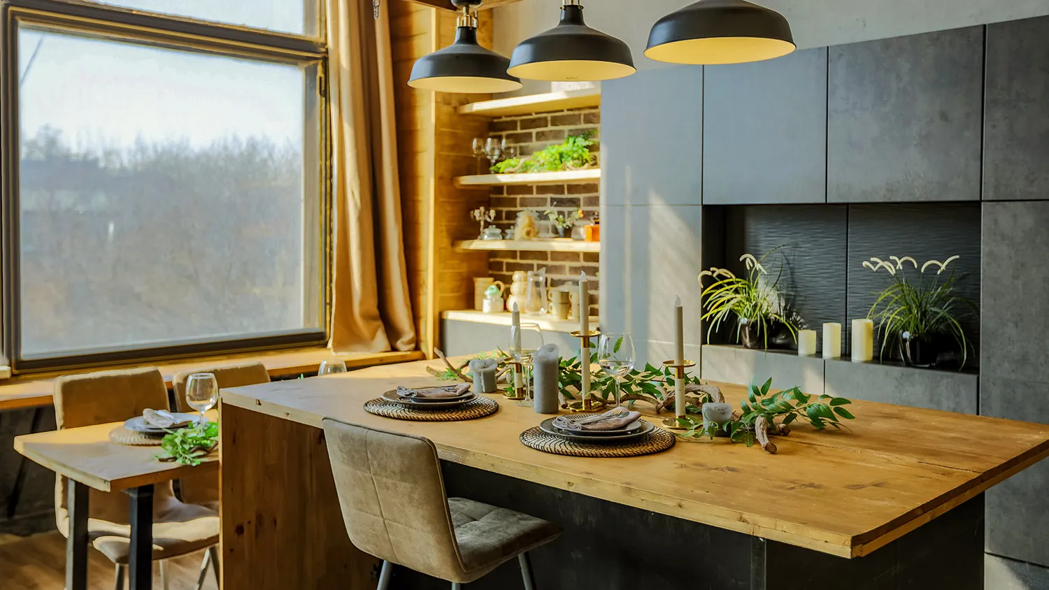 Если позволяет площадь, можно добавить стилистический акцент в виде барной стойки или отдельного острова. Конструкция должна выделяться по цвету, но не нарушать общую цветовую палитру экостиля.