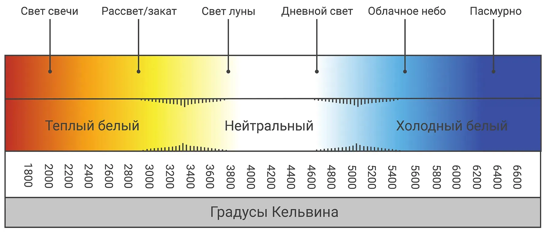 Цветовую температуру обычно указывают на упаковках лампочек и измеряют в Кельвинах (К). Выбирайте лампы с показателем от 2700 до 3200 К: