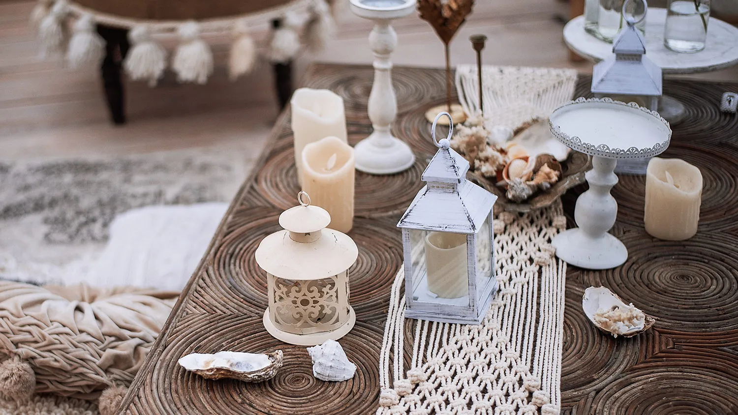 Среди настольных ламп подойдут модели с оформлением под камень или дерево. Усилить антураж можно декоративными фонарями и свечами.
