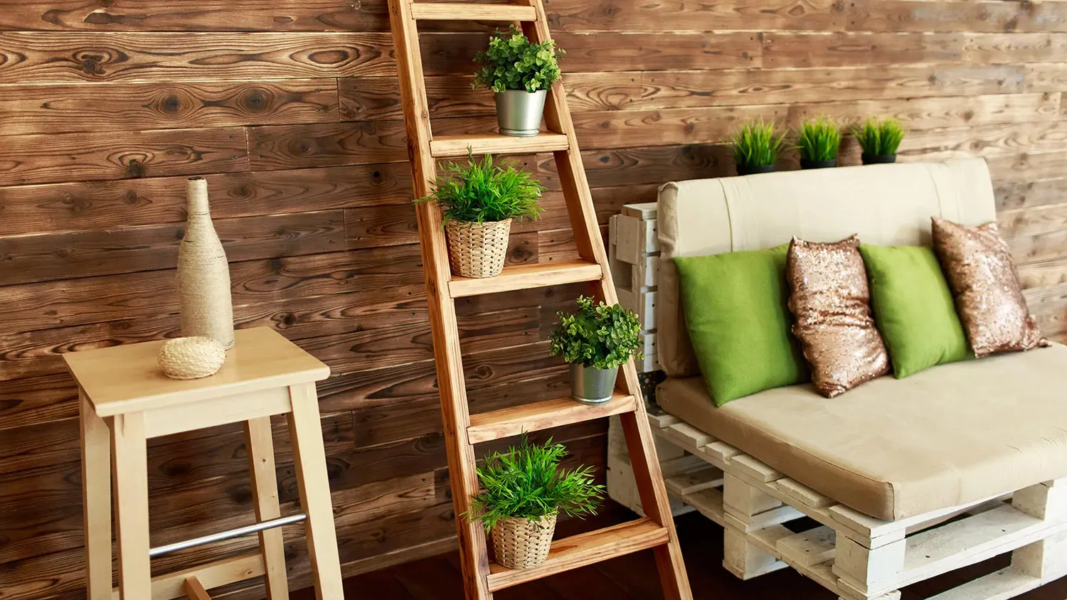 - Вторсырье и переработанные материалы. В экостиле используют фрагменты старых досок, кирпича, бумаги, стекла, чтобы создать аскетичную атмосферу и подчеркнуть идею бережного отношения к ресурсам планеты.