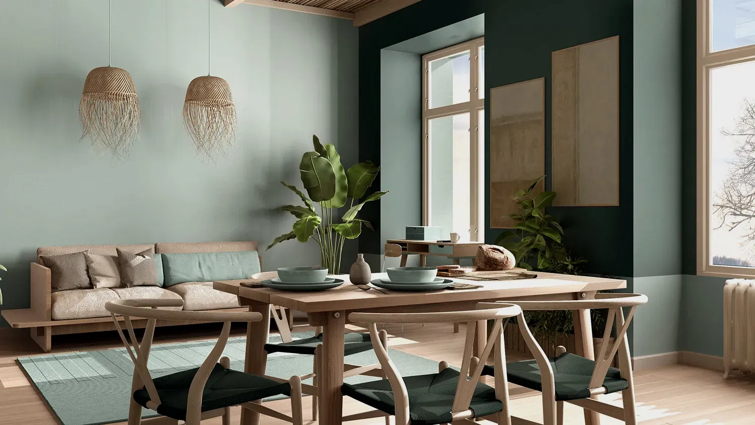 Палитра экостиля основана на естественных оттенках, вдохновленных пейзажами. Преобладают мягкие, приглушенные тона, способные создавать атмосферу покоя и уюта.