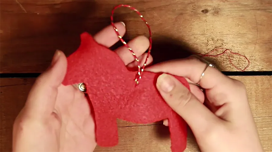 Сделайте петлю для подвеса из ниток или ленты и закрепите ее между двумя заготовками, как на фото. Зафиксируйте на спине лошадки несколькими стежками.