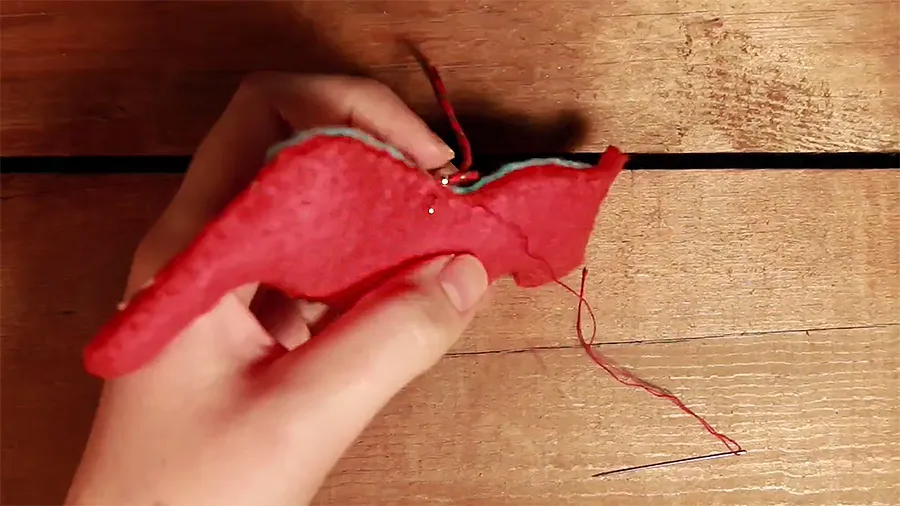 Закройте отверстие потайным швом. Пришейте ленту или узкую полоску ткани — получится прочная петля для подвеса на елку.