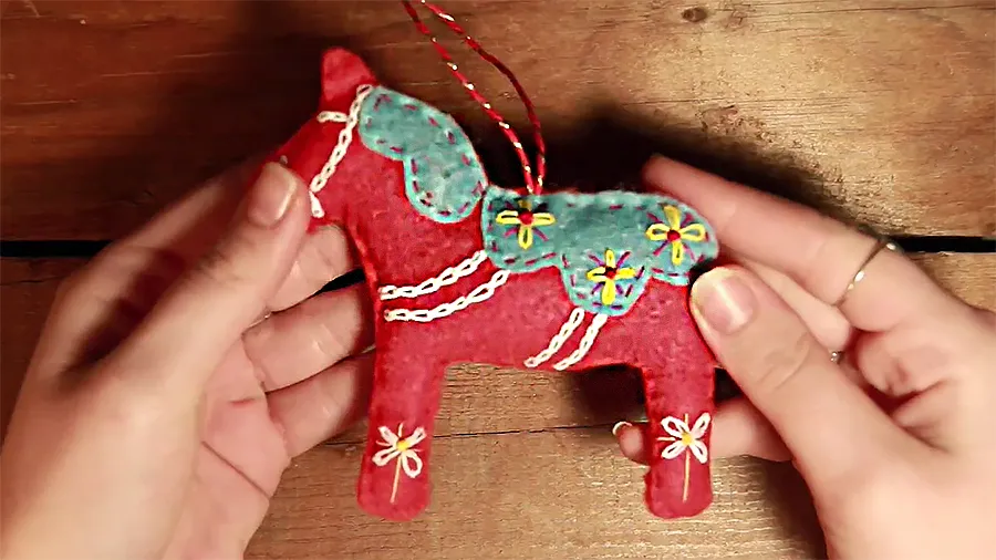 Фетр — удобный материал для новогодних поделок. Он хорошо держит форму, легко режется, а детали можно и пришивать, и приклеивать. Символ 2026 года — Красная Огненная Лошадь, поэтому предлагаем сделать новогоднюю елочную игрушку именного такого цвета. Один из самых простых в исполнении вариантов — традиционная шведская фигурка Дала.