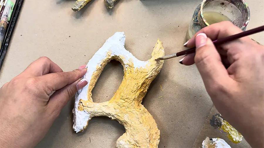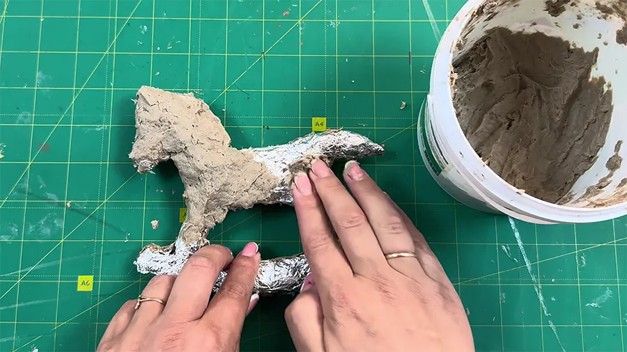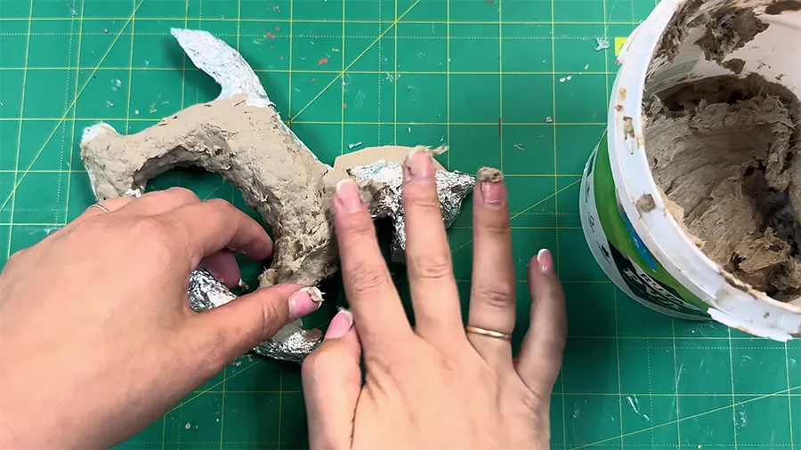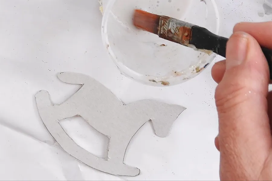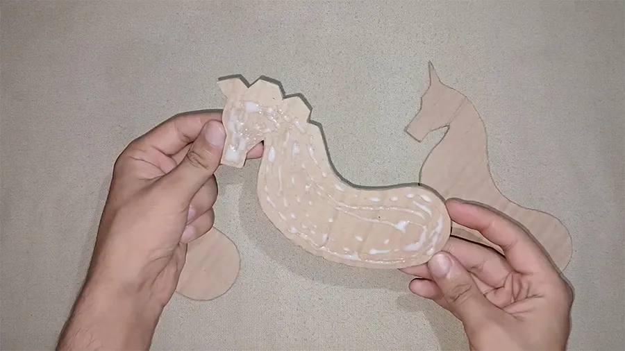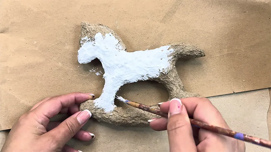 Покройте заготовку с одной стороны плотным слоем целлюлозной массы (бумажная глина) или сделайте домашний вариант — смесь размоченной бумаги и ПВА. Равномерно распределите состав по поверхности лошадки так, чтобы не было пустот, и дайте высохнуть.