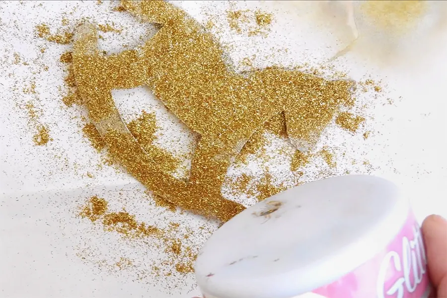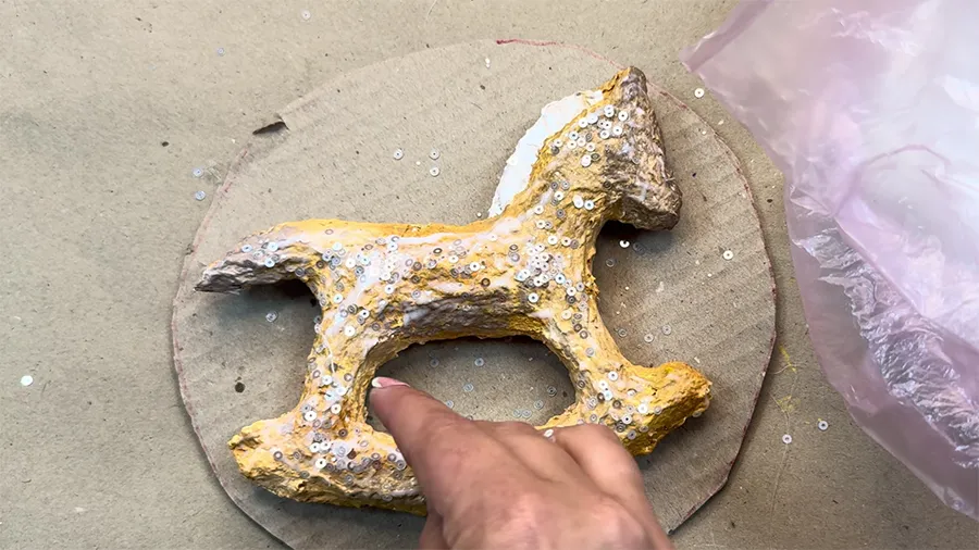 Поверх клея нанесите сухие блестки, равномерно распределяя по фигурке лошадки. Можно работать кистью или аккуратно рассыпать глиттер прямо из баночки. Используйте блестки красного цвета, если хотите сделать символ 2026 года. Дайте высохнуть: обычно хватает получаса. Чтобы превратить поделку в полноценную елочную игрушку, добавьте крепление (прочную нитку или ленту). Приклейте ее к средней части туловища, и лошадку-качалку можно вешать на праздничное дерево.