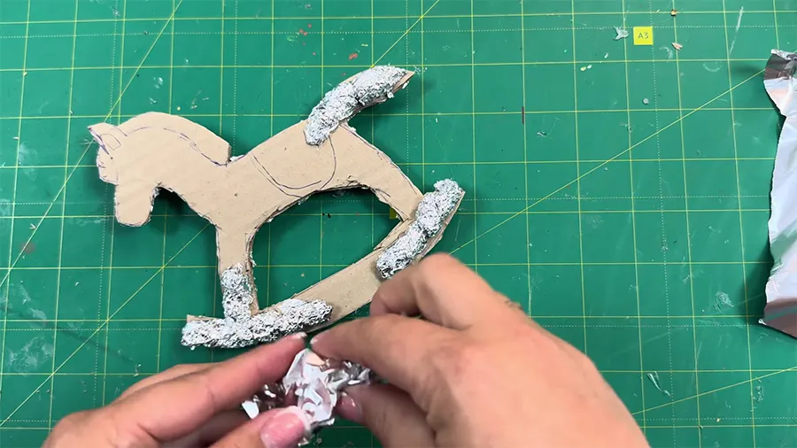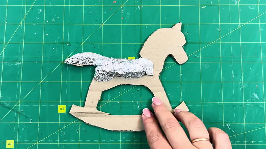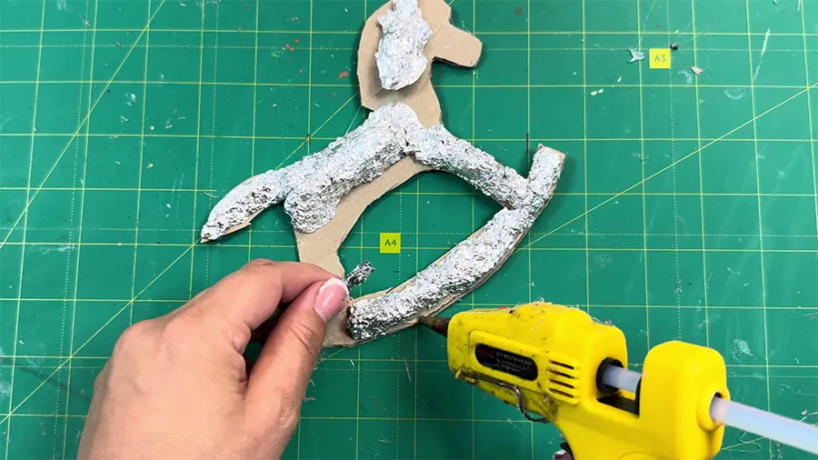 Нарисуйте на картоне и вырежьте силуэт будущей игрушки (можно использовать шаблон из второго раздела статьи). Нанесите на основу универсальный клей и сформируйте объем из фольги, равномерно распределяя ее по заготовке. Комкайте и прижимайте материал, чтобы он образовывал плотную горку и держал форму.