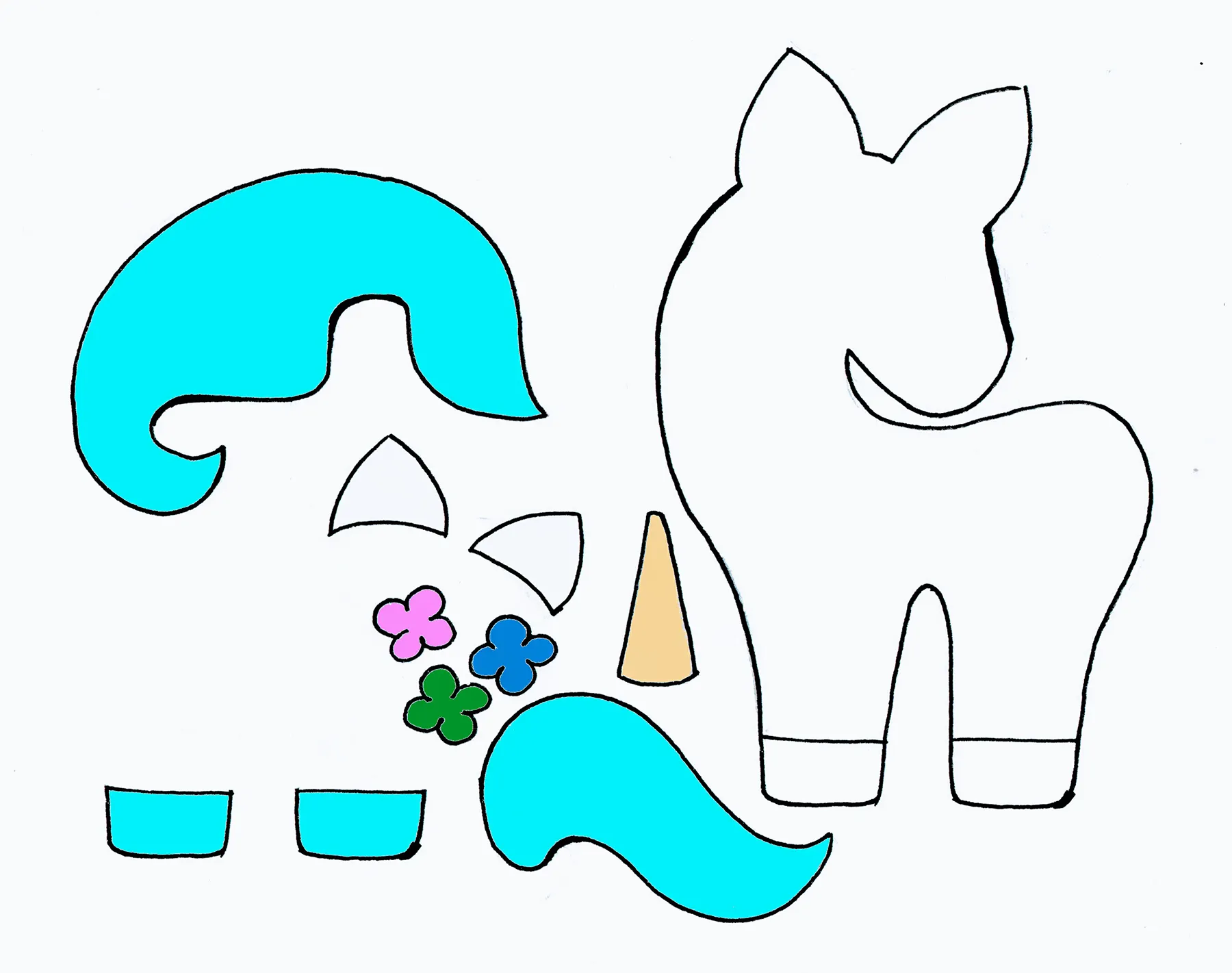 Для создания тканевой игрушки в виде лошадки понадобится выкройка. Ее можно нарисовать на листе бумаги или скачать и распечатать: