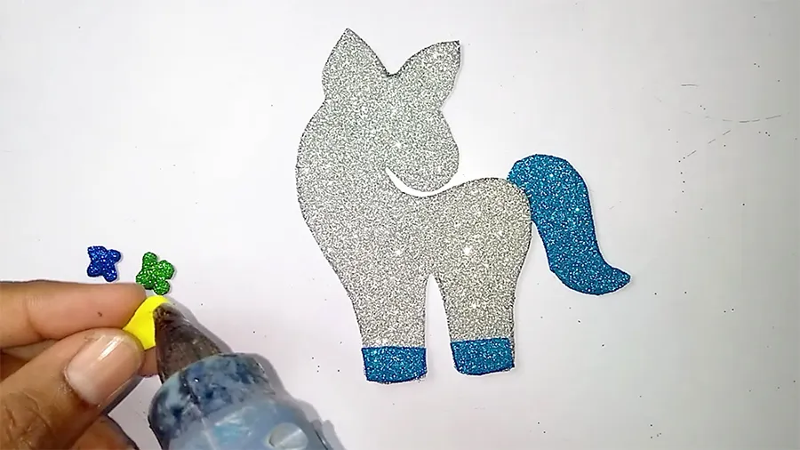 Сделайте то же самое с гривой, челкой, хвостом и копытцем лошадки. Используйте фоамиран другого цвета или нескольких, чтобы елочная игрушка получилась более яркой.