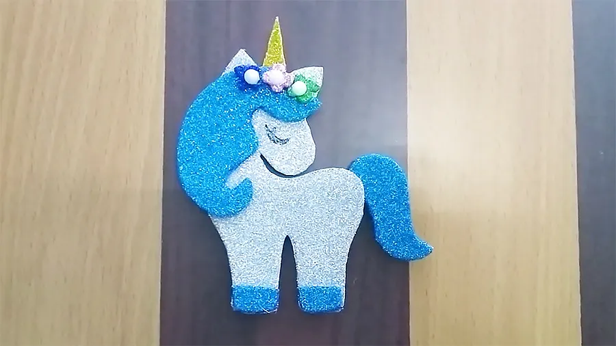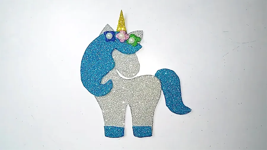 Красивую сказочную лошадку на елку легко сделать из фоамирана — мягкого вспененного материала, который хорошо держит форму. Его часто используют для создания поделок, поскольку с ним справится и новичок, и ребенок. Фоамиран бывает разных цветов, матовым или с блестками — можно подобрать нужный дизайн и не красить материал дополнительно.