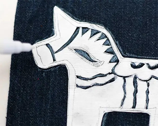 Перенесите шаблон на джинсу белым маркером или ручкой по ткани. Нужно сделать два экземпляра.