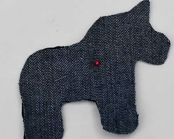 Вырежьте обе заготовки лошадки и сложите их лицевыми сторонами друг к другу. Зафиксируйте булавками. Прошейте на машинке или вручную по контуру, оставив небольшое отверстие внизу для наполнителя.