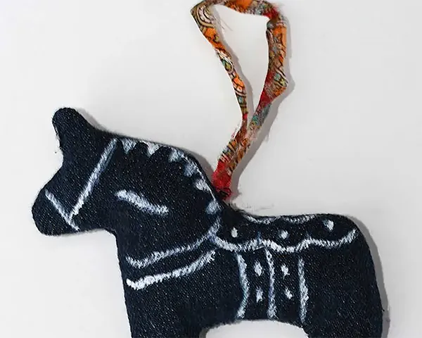Декорируйте лошадь по желанию и сделайте подвес из любого подходящего материала. Аккуратно приклейте его к стыку головы и туловища, чтобы игрушка висела на елке ровно.