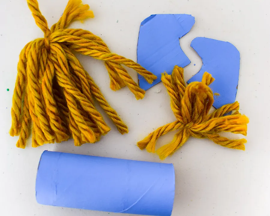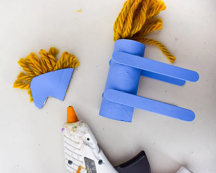 Пока сохнет краска, сделайте гриву и хвост лошади. Можно взять тот же картон, вату или, как в этом примере, нарезать толстую пряжу, связать в пучок и приклеить к корпусу.
