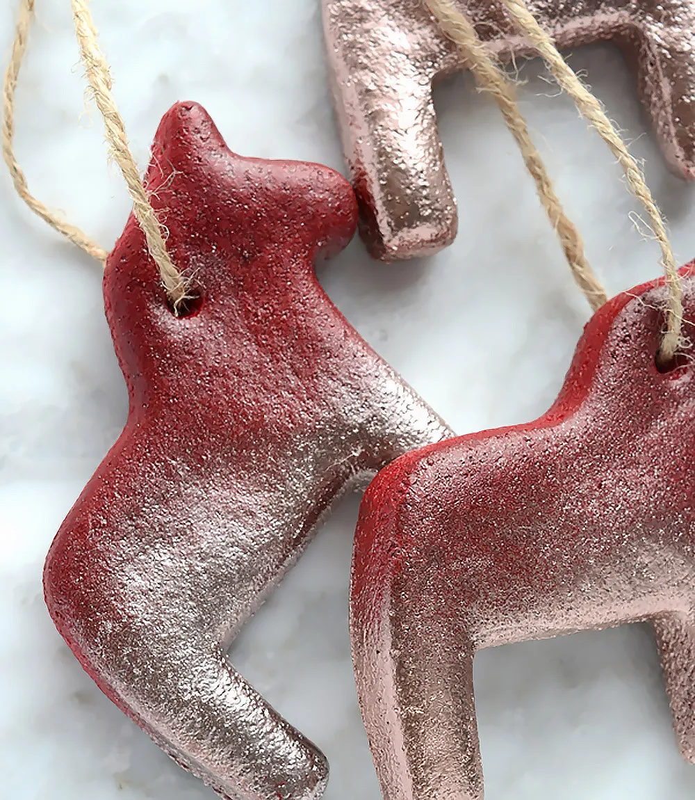 Чтобы приготовить тесто для поделки-лошадки, смешайте 2 стакана муки и стакан соли. К ним добавьте полстакана чистой воды, опционально — столовую ложку ПВА, чтобы тесто было более податливым. Затем раскатайте его, сформируйте фигурку лошади и заранее проделайте отверстие под подвес. Полностью просушите заготовку. При комнатной температуре это занимает 1–2 дня, в разогретой духовке – около часа.