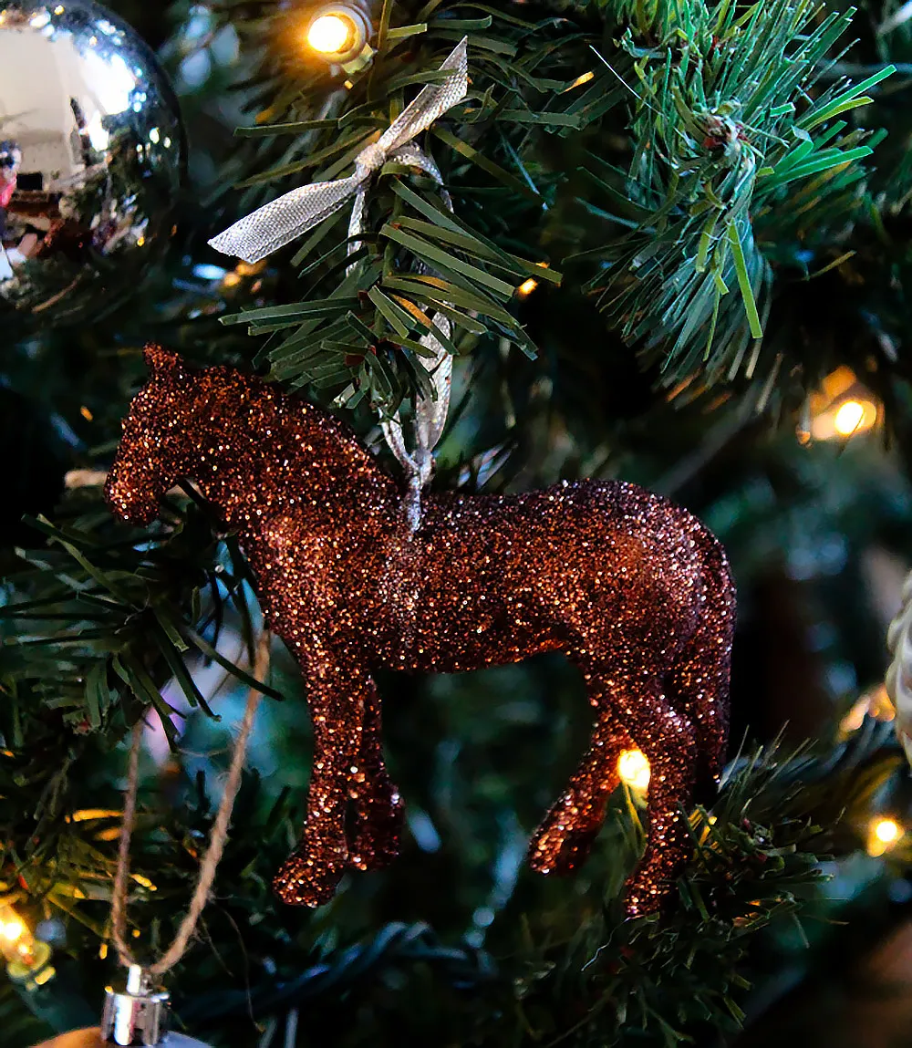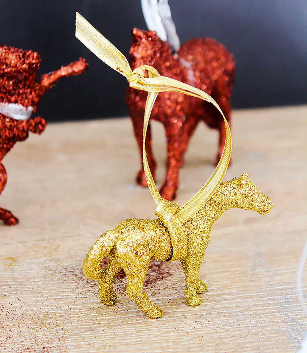 Наконец, самый простой вариант самодельной игрушки для новичков. Если у вас есть небольшая пластиковая лошадка, например старая игрушка или ненужная фигурка, ее легко превратить в нарядное елочное украшение. Работа займет буквально несколько минут: нужно только покрыть фигурку клеем и блестками.