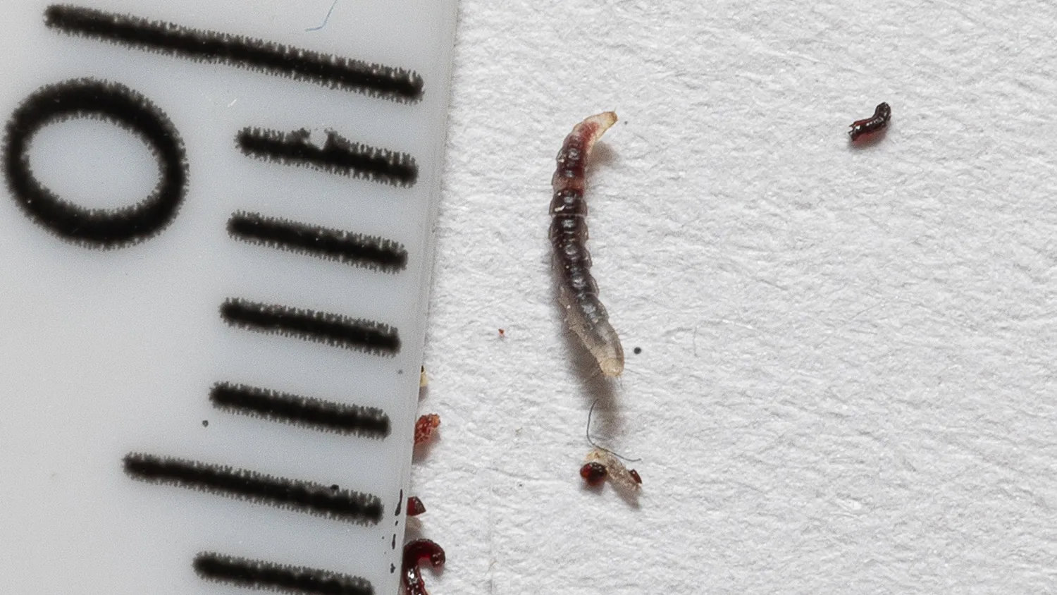 - Личинки в виде белого червячка боятся света и прячутся в ковровый ворс, под мебель, в трещины. Они питаются остатками органики и фекалиями взрослых особей. Насекомые на этой стадии чувствительны к обработке, но не ко всем препаратам.