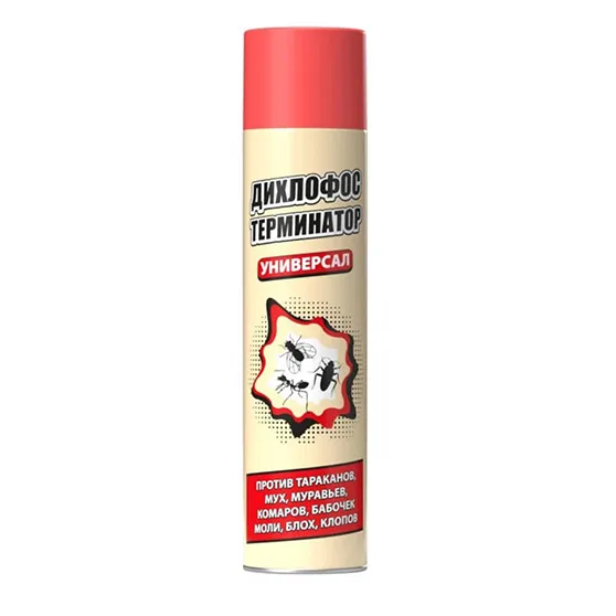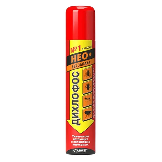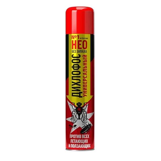 - «Дихлофос» («Нео+», «Варан»). Аэрозольное средство для уничтожения ползающих и летающих вредителей. Содержит три вида ядов и усилитель. Действует сразу и создает защитный барьер до двух недель. Без отдушек и спиртового запаха.
