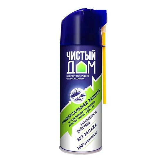 - «Чистый дом». Серия спреев для борьбы с мокрицами, блохами, клопами и другими вредителями. Действуют сразу или в течение 2–4 часов. Удобный формат с трубочкой для труднодоступных мест.