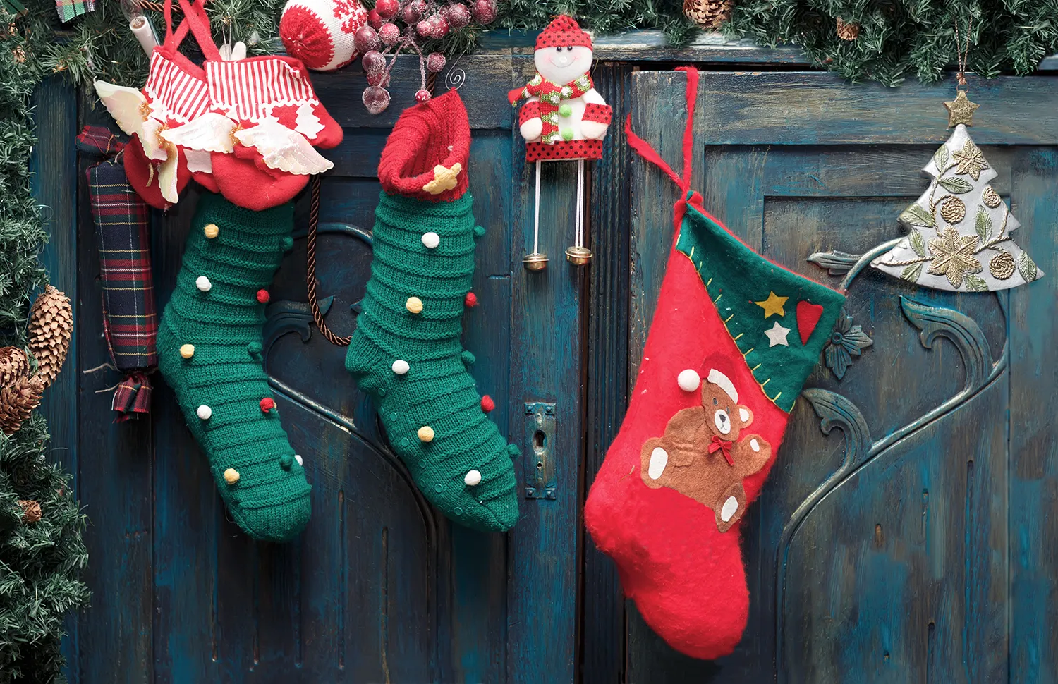 Классическое решение — новогоднее оформление из комбинации традиционных рождественских цветов: зеленого, красного, белого, золотого и серебряного — плюс шишки и крафтовая бумага.