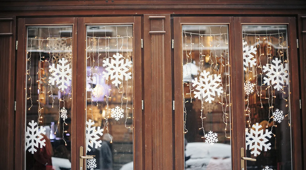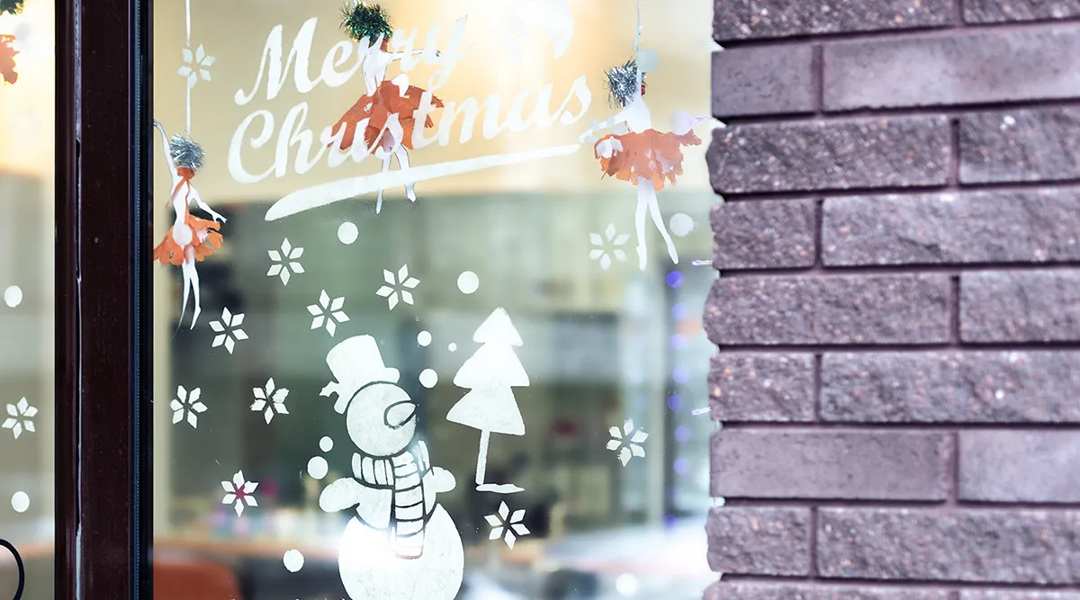 Украшаем стекла. Протираем их жидкостью для очистки окон и опрыскиваем водой. Снимаем с наклейки защитный слой, прикладываем к окну, расправляем полотенцем. Наклеивание одной займет 5 минут.