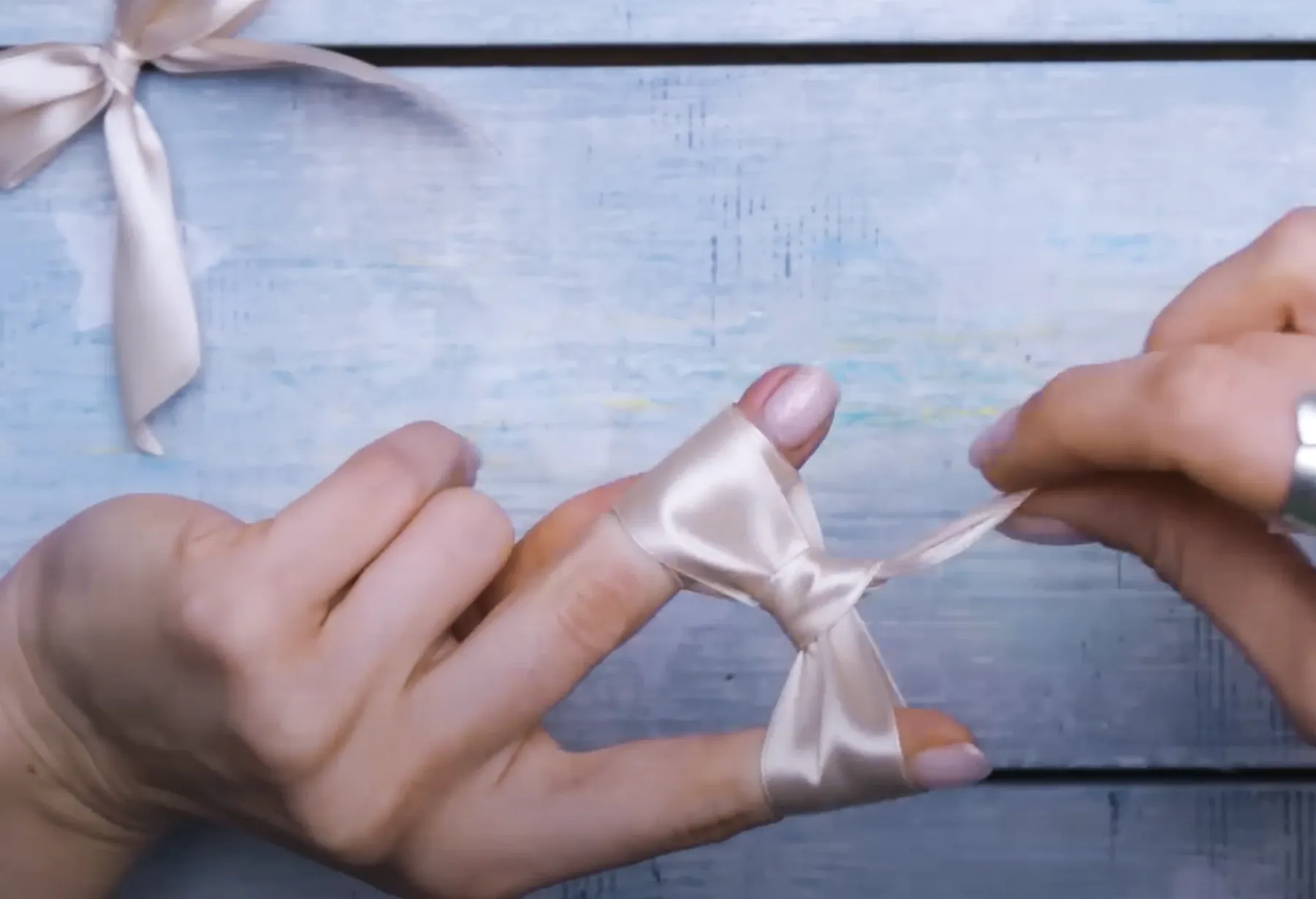 Делаем банты. Отрезаем от ленты по 70–80 см. На елку понадобится 15–20 бантов. Но мы сделаем больше (25–30 шт.) — они нам пригодятся еще для рождественских венков, гирлянды и декора штор. Самая простая схема изготовления пышного банта: между большим и указательным пальцем оборачиваем 3 раза ленту восьмеркой, концы завязываем, бант расправляем. На один бант уходит примерно 30 секунд.