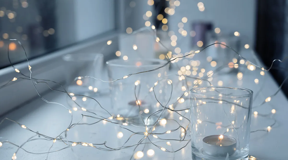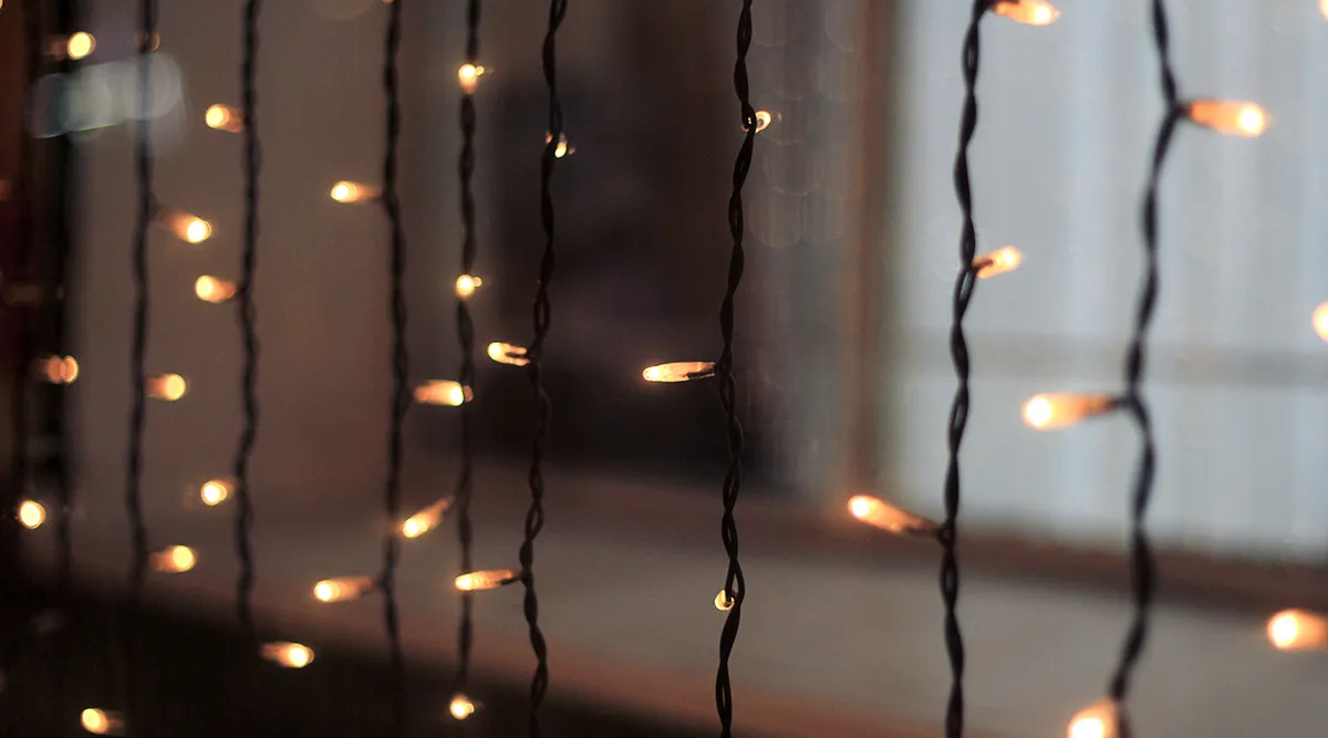 Крепим к карнизам светодиодные гирлянды на монтажную ленту. На одно окно уйдет не больше 5 минут.
