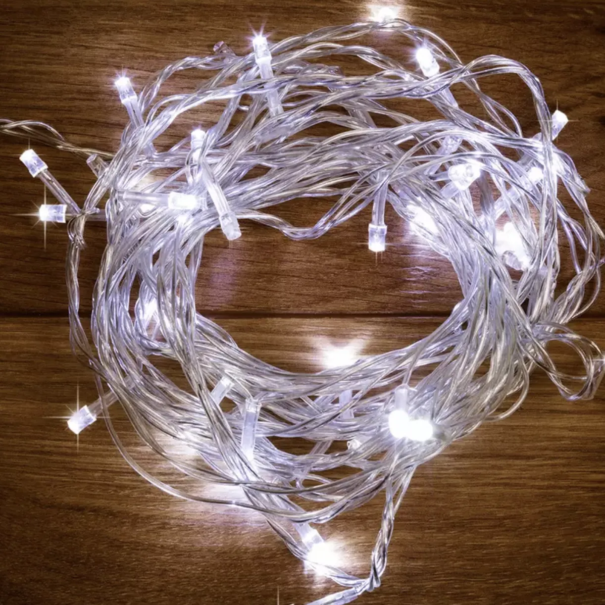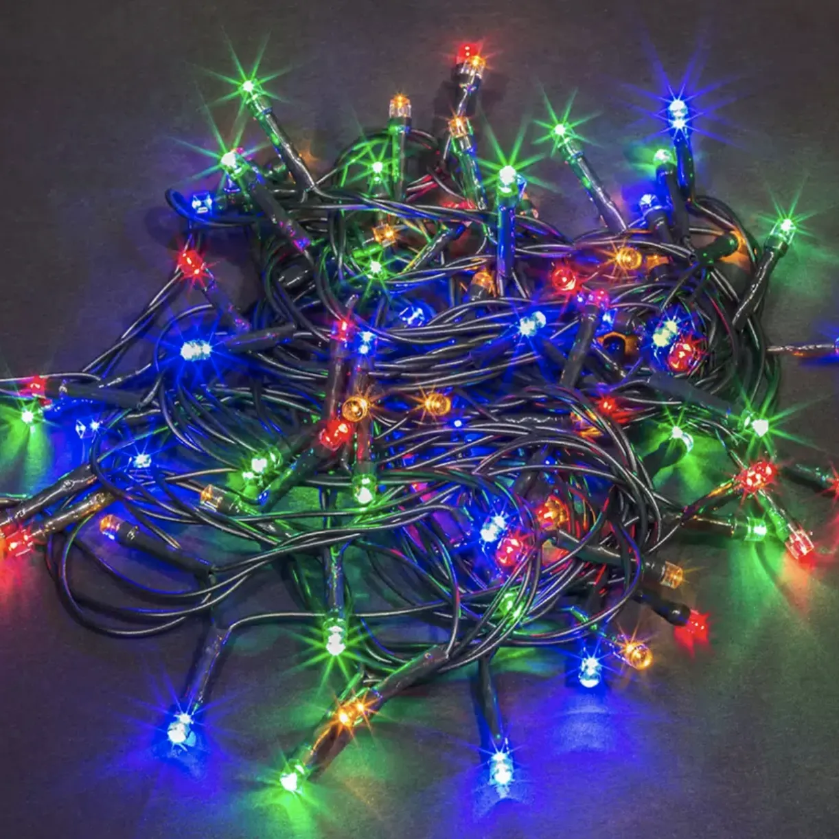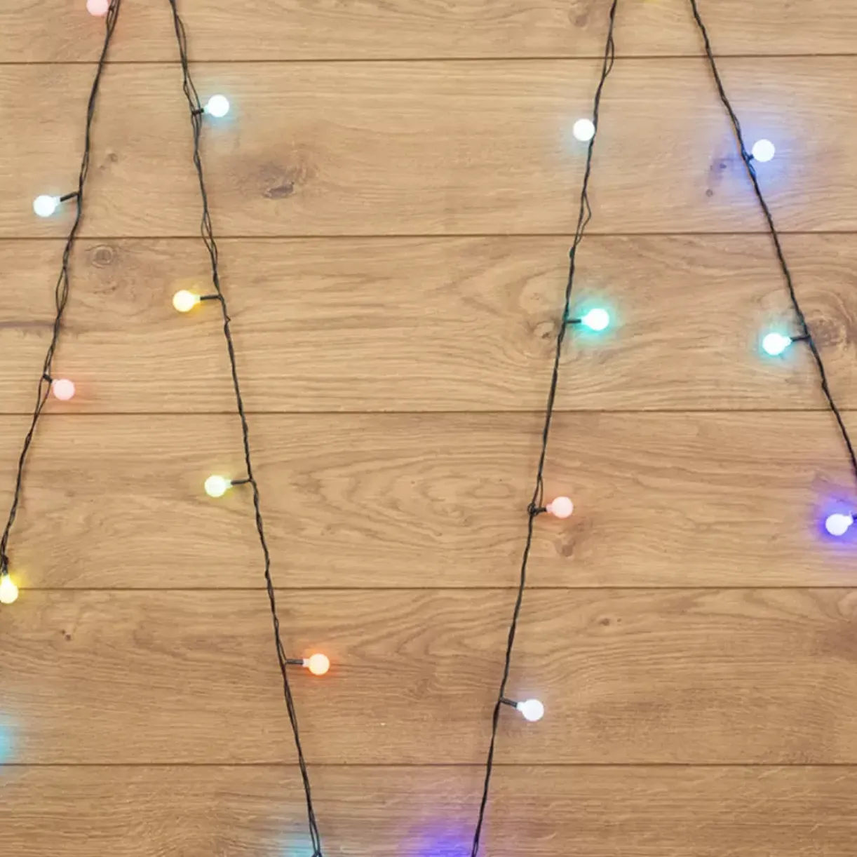 Вешаем электрогирлянды. На елку 180 см понадобится одна гирлянда длиной примерно 10 м или две по 5 м. Крепим центр гирлянды ближе к макушке. Берем один конец и распределяем зигзагами вниз по часовой стрелке. Потом так же вторым концом — против часовой.