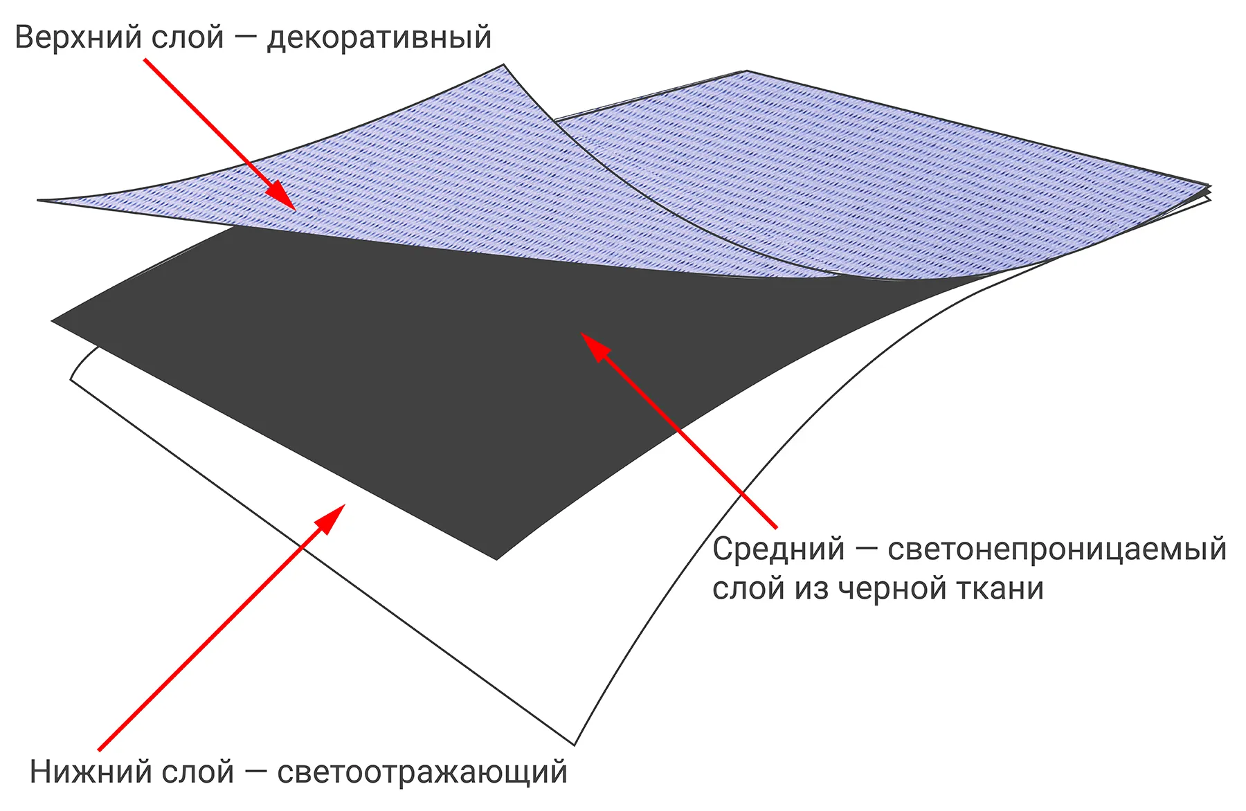 Не все плотные шторы можно отнести к этой категории. Светонепроницаемые разновидности изготавливают из одноименного материала блэкаут, состоящего из трех слоев: