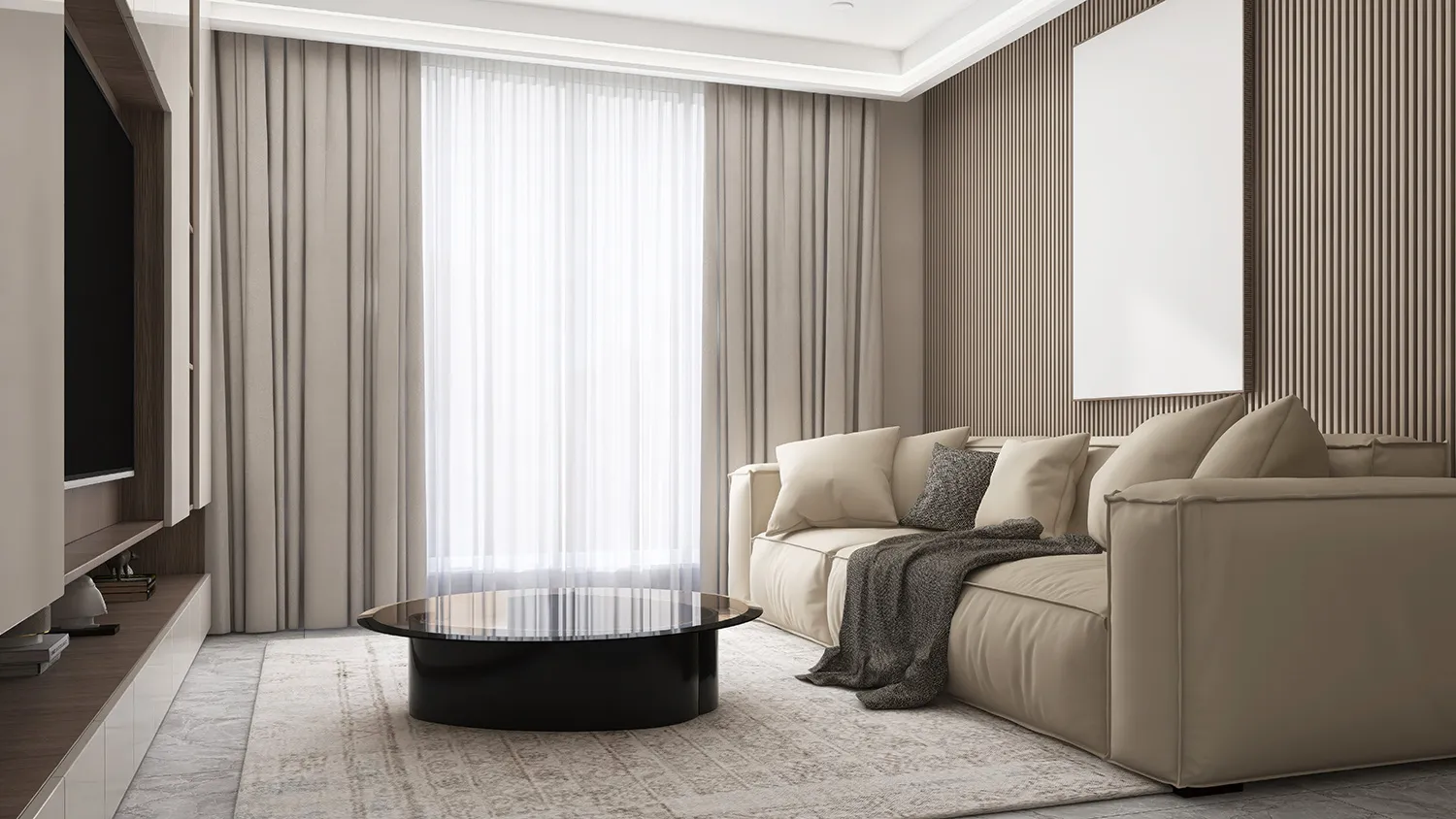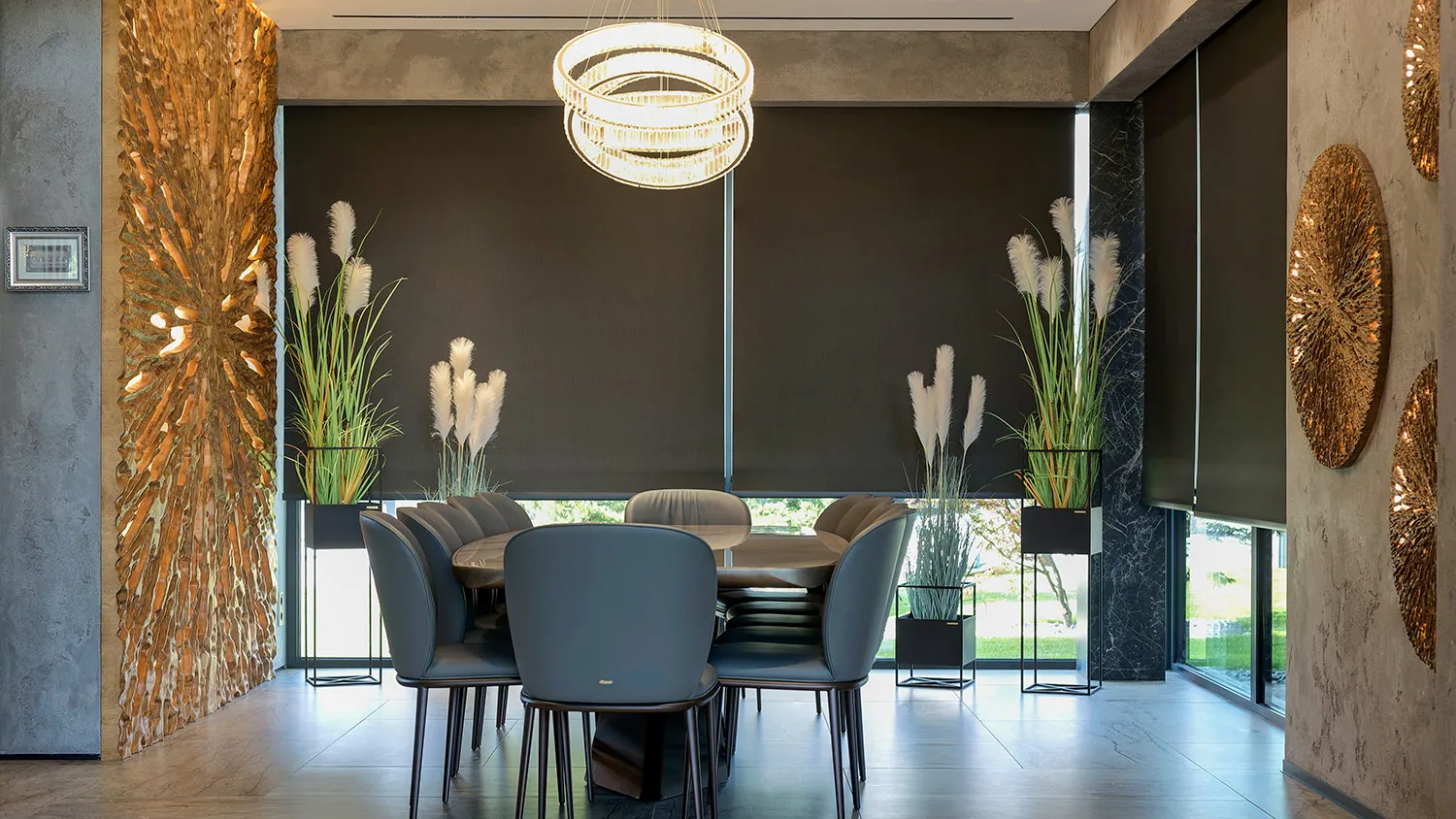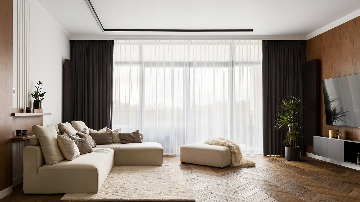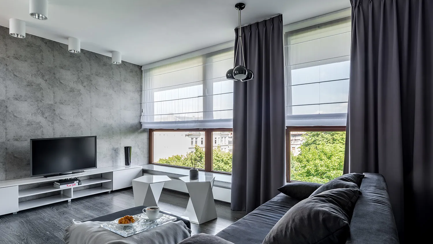 В комнате для приема гостей и семейных мероприятий нужно обеспечить приватность, чтобы защитить личную жизнь от любопытных глаз прохожих и соседей напротив. А также важно создать благоприятные условия для вечернего отдыха или просмотра телевизора, чтобы на экране не мелькали блики.