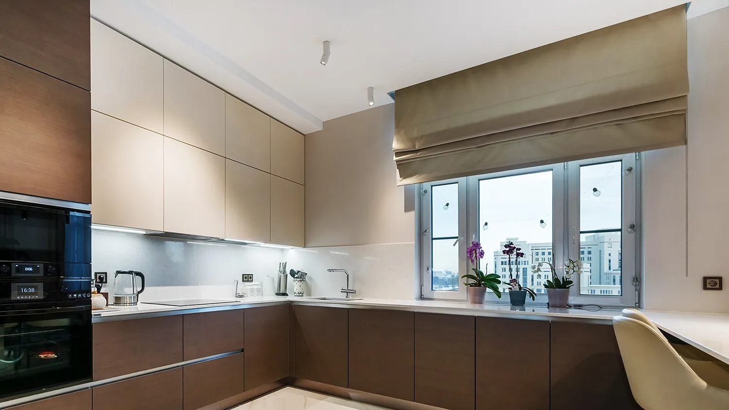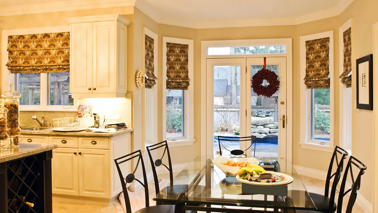 Обычно место для приготовления еды не нуждается в сильном затемнении. Достаточно возможности рассеивания интенсивных солнечных лучей. Но нередко кухня становится местом для семейных и романтических ужинов, когда нужна расслабляющая притененная обстановка. И важно, чтобы ее не нарушали посторонние взгляды.
