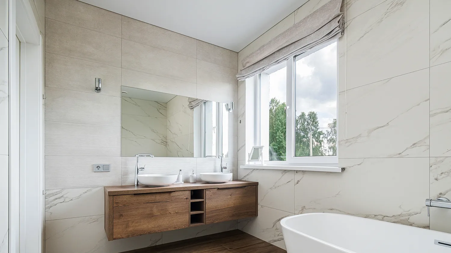 В последнее время набирают популярность архитектурные решения с окном в ванной комнате. Это обеспечивает доступ свежего воздуха, устраняет запахи и влажность, визуально расширяет пространство и открывает красивый пейзаж, однако приводит к потере чувства приватности.