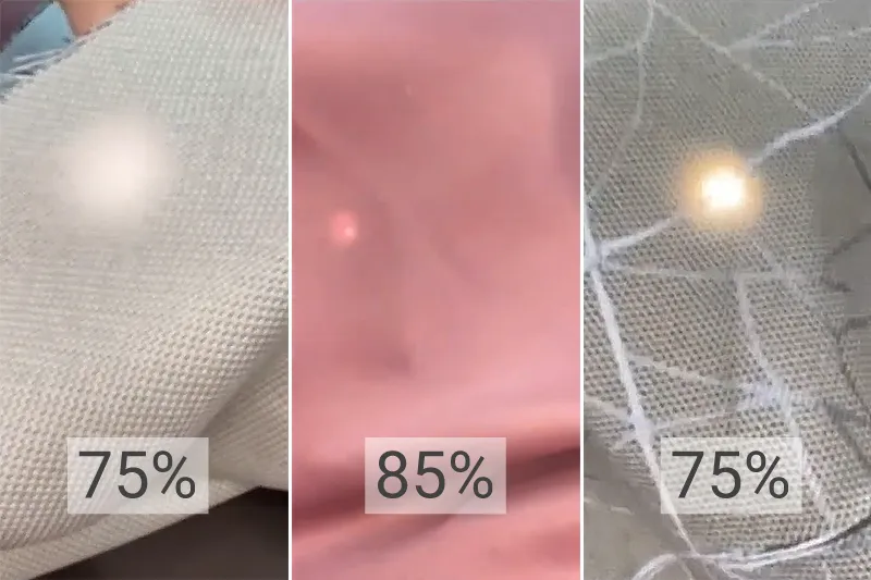 Включите фонарик на своем телефоне. Поместите его под один слой ткани. Часто в хангерах образцы крепят в сложенном виде, формируя складку. Поместите фонарик между слоями, иначе тест будет неинформативным.