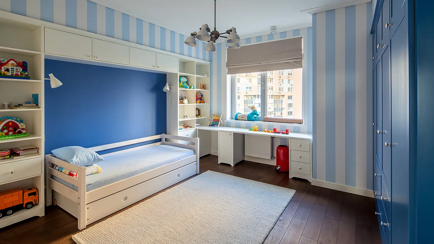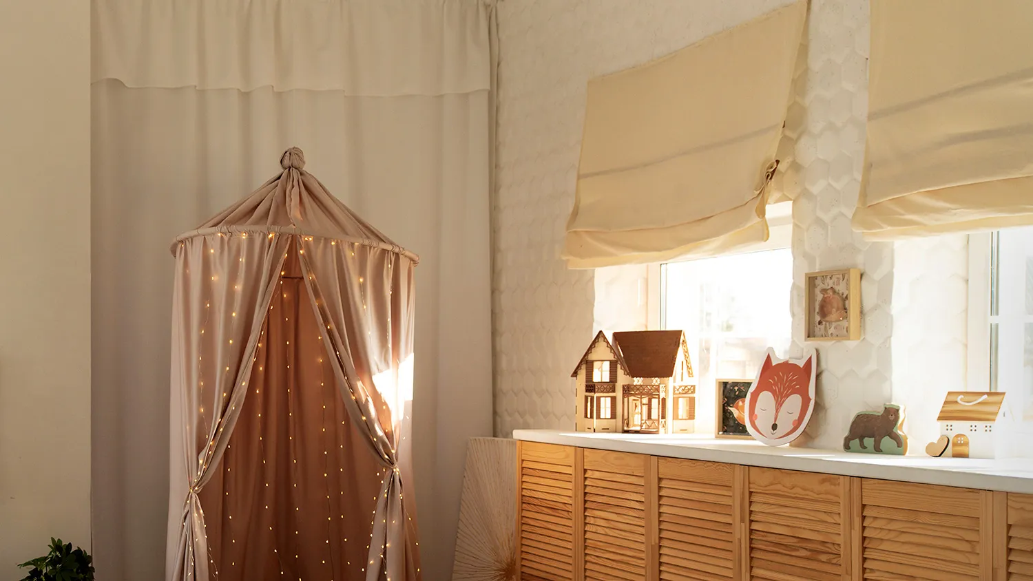 Шторы блэкаут в детскую выбирают с учетом возраста и степени активности ребенка. Важно, чтобы их форма была безопасной — тяжелые портьеры на массивных карнизах лучше не использовать. Часто берут компактные рулонные и римские блэкаут-шторы, которые сложно задеть во время игр. Маленькие дети не смогут оборвать их с карниза, поскольку обычно длина соответствует высоте оконного проема.