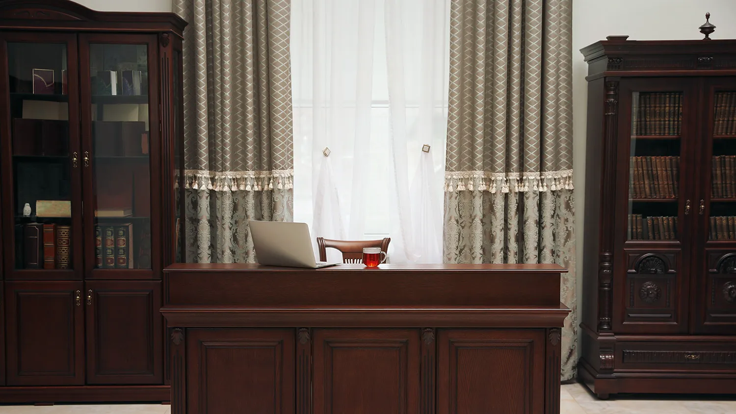Однако стоит учитывать и обратную сторону медали — абсолютная темнота не располагает к концентрации, а, наоборот, расслабляет. Даже мощные светильники в качестве подсветки функциональных зон для чтения и работы создают ощущение ночи вокруг. По этой причине оптимальным решением для кабинета станут шторы средней плотности с эффектом димаут.