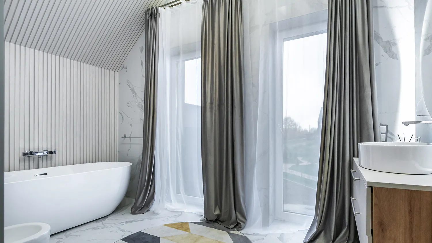В зависимости от общего стиля интерьера, расположения сантехники, площади и конфигурации помещения вешают разные виды гардин: