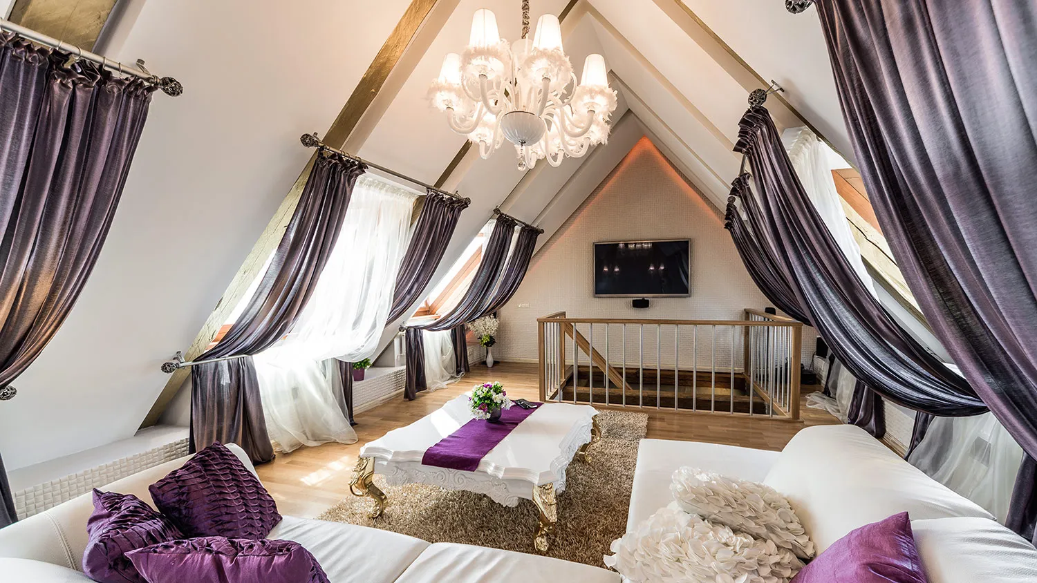 Сделать проживание в помещении под крышей комфортным помогут шторы блэкаут для мансарды. Благодаря высокой плотности материала они обеспечивают хорошую термоизоляцию: в холодное время года помогают удержать тепло внутри, а летом снижают нагревание воздуха и предметов от палящего солнца.