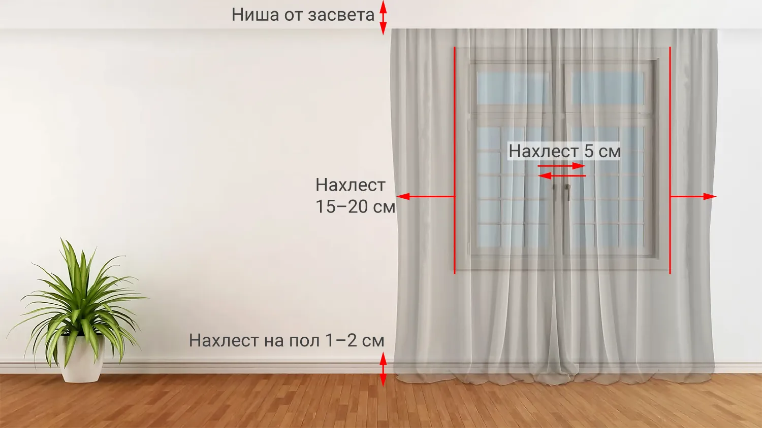 - Занавеси должны заходить на стены минимум на 15–20 см с каждой стороны окна.